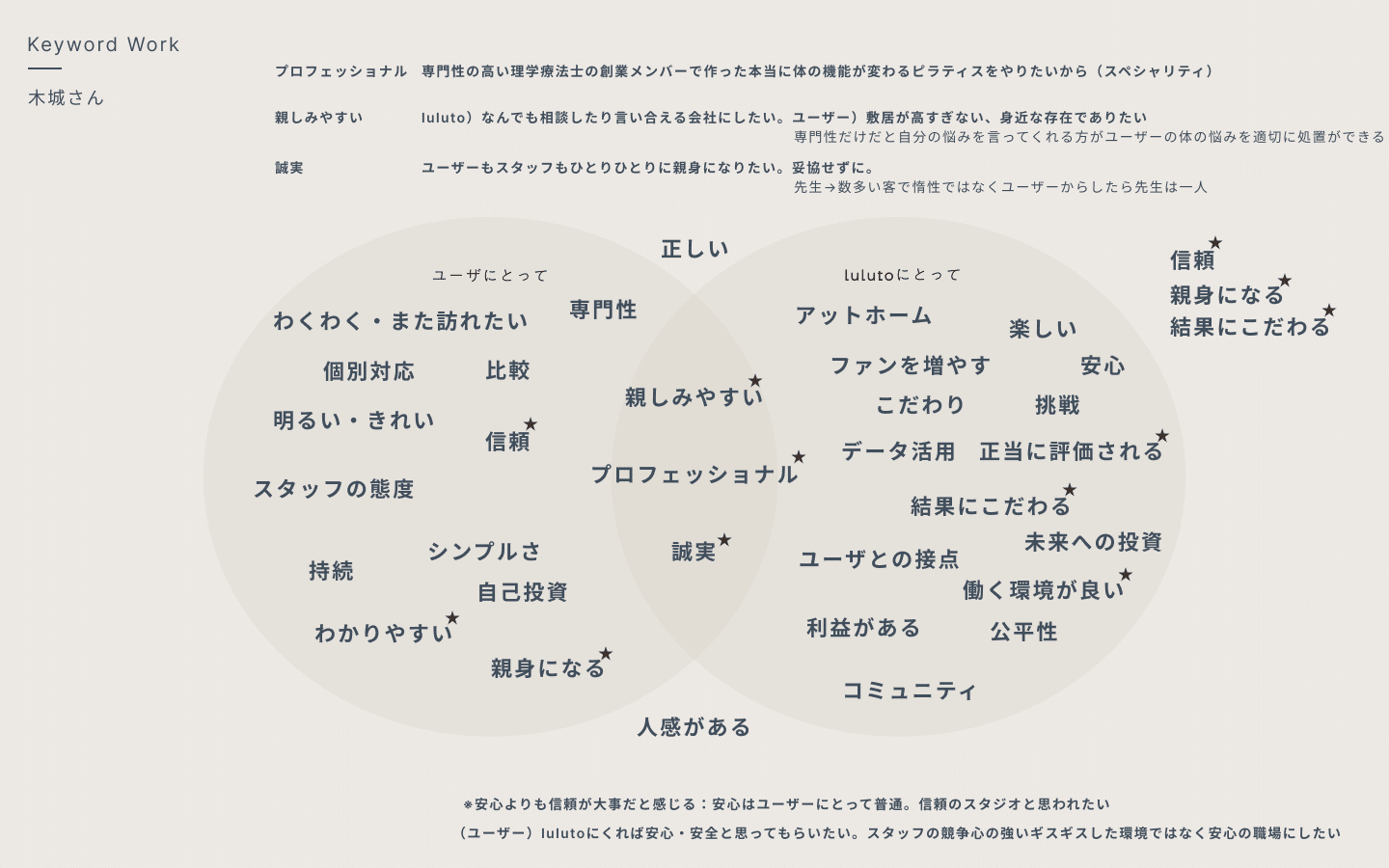 その課題をクリアするために、すぐに言語化を進めました。組織の課題や木城さんが感じる経営課題、現場の課題をヒアリングした上で、コンセプトの整理や、カスタマージャーニー、数値の分析などを進めました。