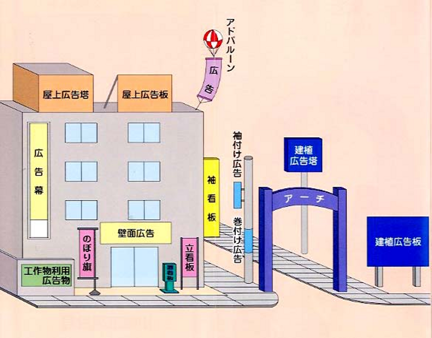 ・幕・壁面・旗広告:看板広告にくくられることもありますが、広告幕形式のものや壁面に貼るもの、店頭に立てる旗や、広告板、柱の横の巻きつけ広告や袖付け広告、アドバルーンや、店頭の広告塔・アーチなども屋外広告の仲間