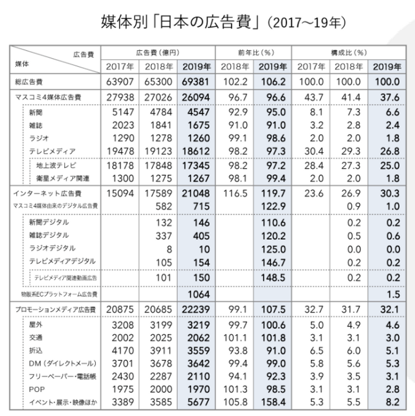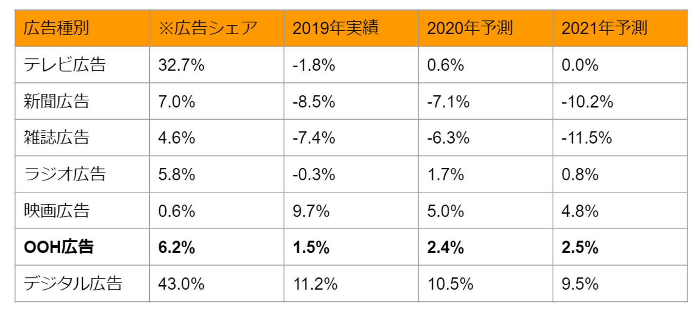 次に日本の広告費を見ていくと、2019年はデジタル広告の牽引によって6%ほどの成長でしたが、「屋外広告」「交通広告」を見ていくと、ほぼ前年100%程度しか推移していないことがわかります。