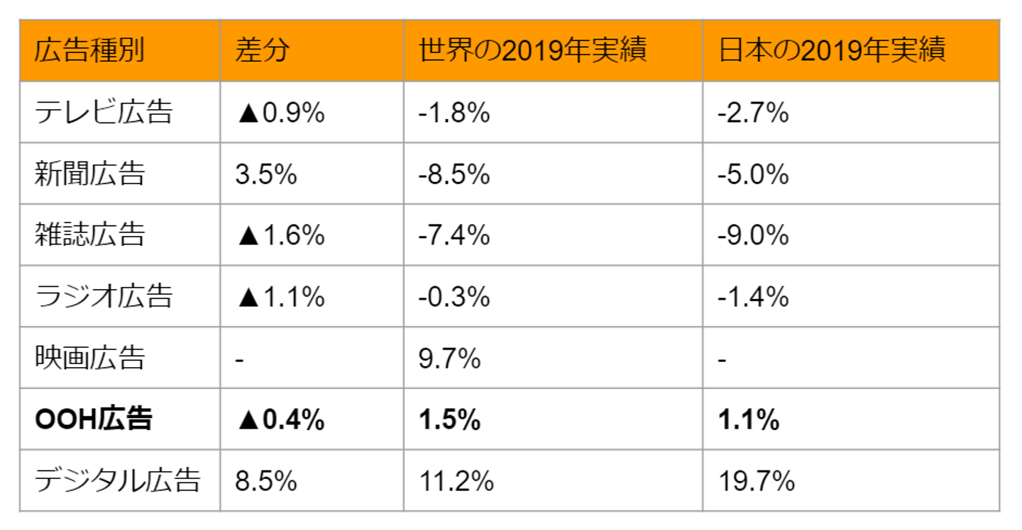 世界の伸び率と比較してみると、デジタル広告の日本での特異的な牽引と比較や、都市部への人工集中などを鑑みると、OOH広告の伸びがあまりに小さいことがわかります。