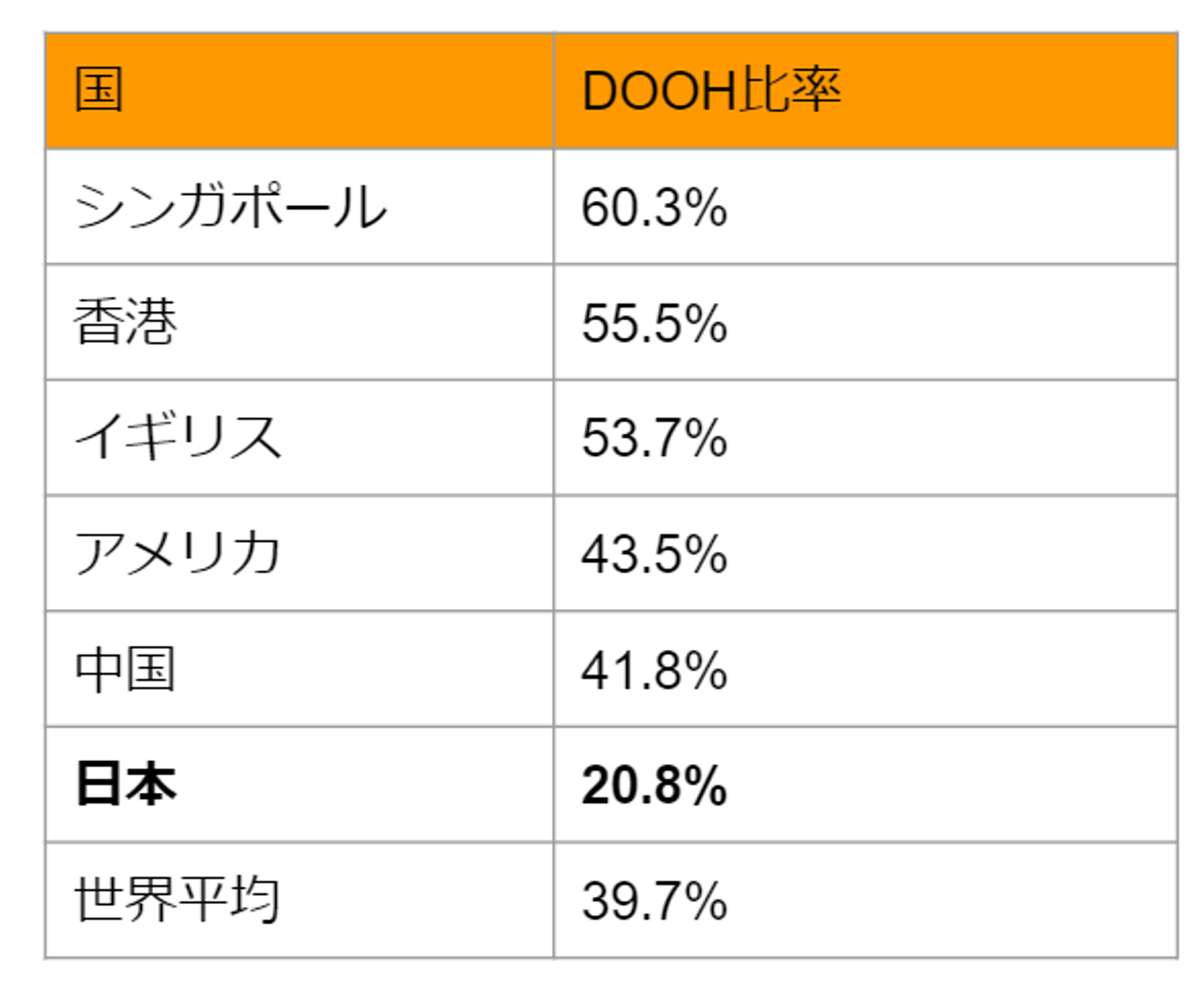 こちらの日本のDOOH比率は、世界的に見ても非常に低い数値であることがわかります。これにより