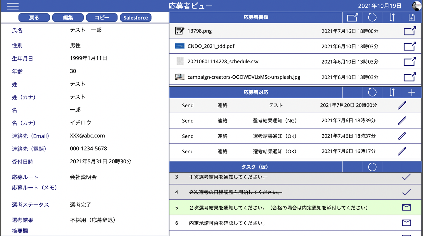 ・促しメールアドレスに返信された内容は応募者の対応記録として自動作成して紐付けます。また添付ファイル(履歴書等)も同様にドキュメントリストに格納して紐づけます。応募者のステータスを変えるとそのステータスで必要なタスクを促していきます。上記画面イメージでは1応募者に対する各種データを1画面で構成しています。