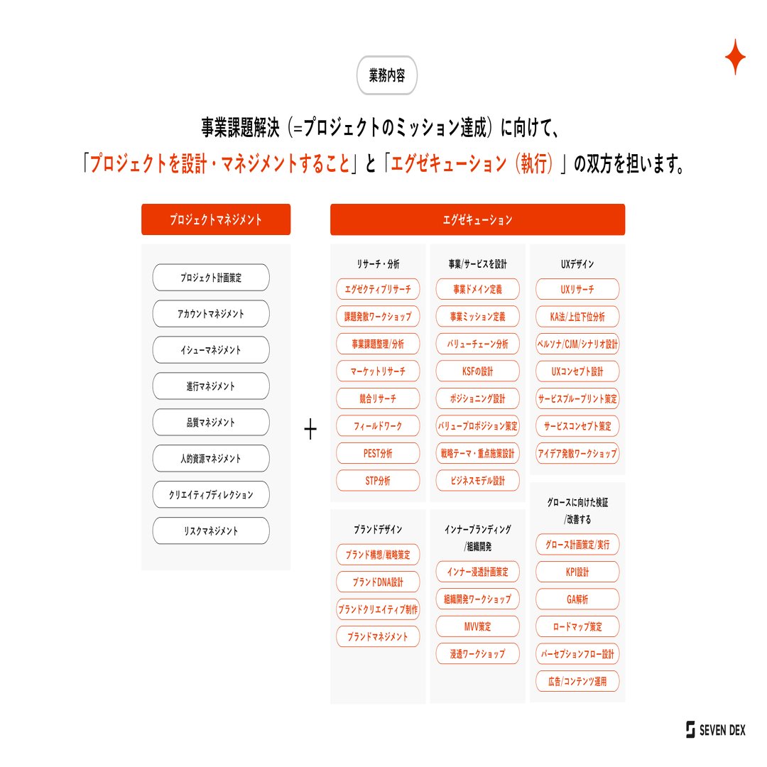 事業課題解決に向けて、プロジェクト設計・プロジェクトマネジメントから執行を双方を担います。支援領域の職責に留まらず、越境することが特徴です。詳細の業務内容は、以下採用資料を参考にしてください。