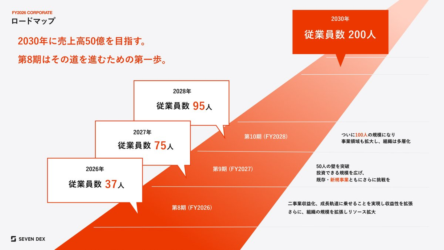 セブンデックスの今後の展望は、4年後の2030年に売上50億・従業員200人規模を見据え、組織と事業の両面で成長を加速させています。