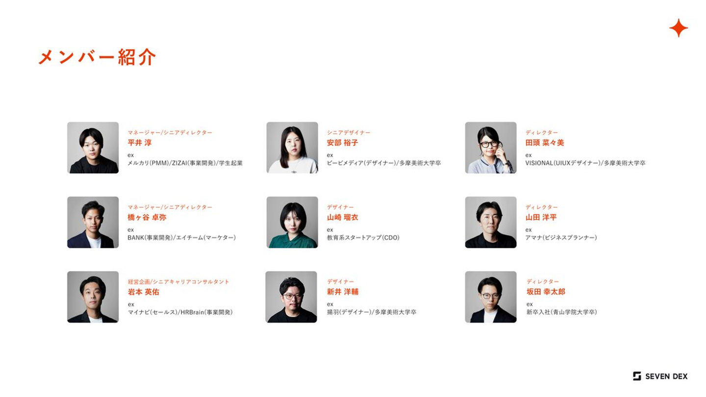 出身企業は、メガベンチャーやスタートアップが多く、事業会社経験者が組織の50%でもあることも特徴的です。そのため、セブンデックスで初めてクライアントワークを経験するメンバーが大半です。