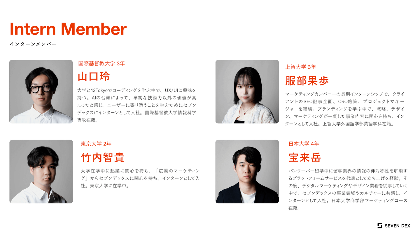 セブンデックスのインターン生たちは、どのような目標を掲げ、どのような思いで働いているのか。そして、なぜ学生時代の貴重な時間をこの場所に投下することを決めたのか——。その視点からは、現代の学生たちのキャリア観と、セブンデックスの人と向き合う組織カルチャーが見えてきました。