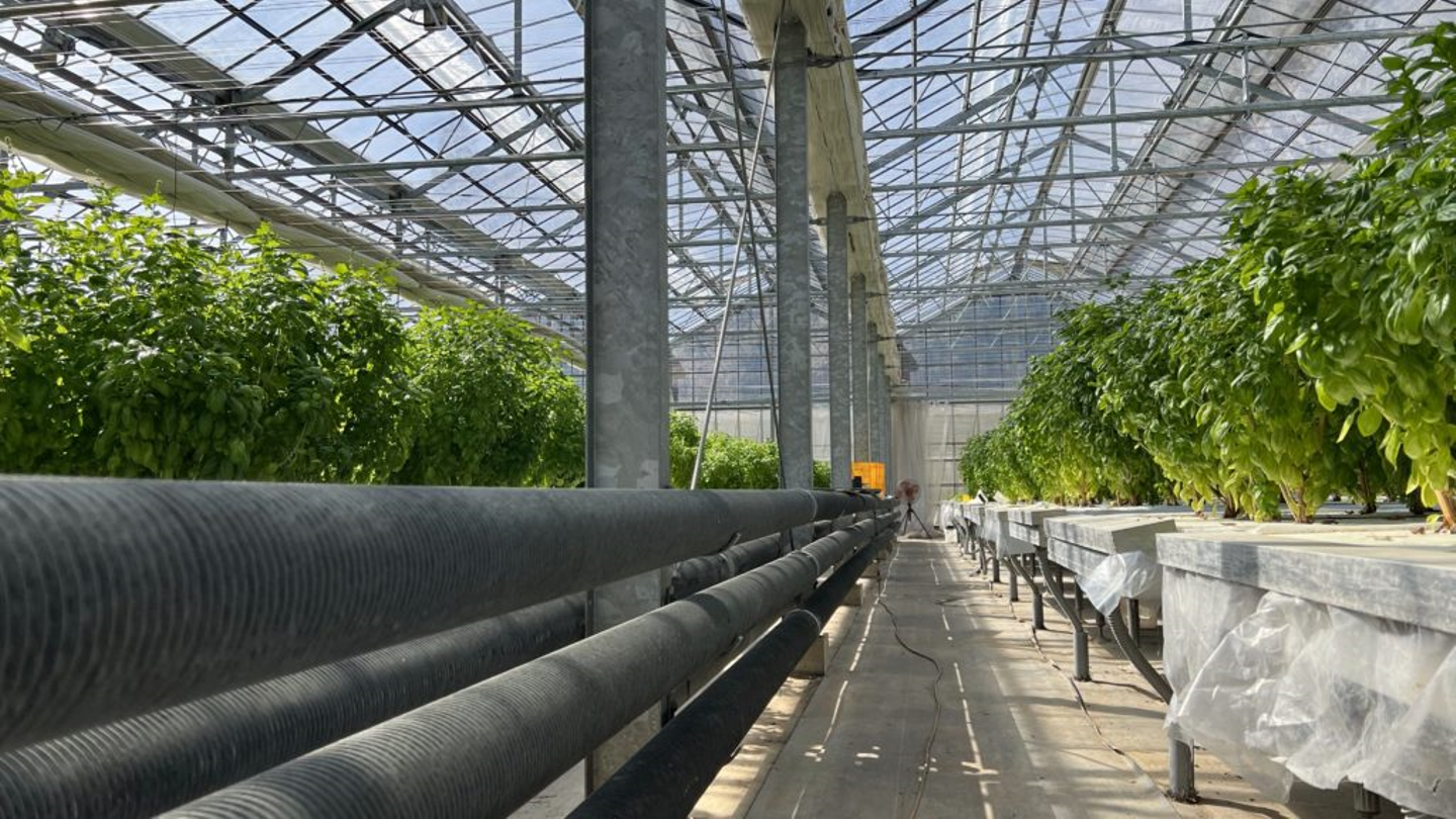 発電所の還元熱水を活用した温室農業用ハウスです。室温が15度を下回るとエロフィン管内にお湯が流れ、室内が加温される仕組みです。現在はバジルとミントを栽培しており、全国へ出荷しています。
