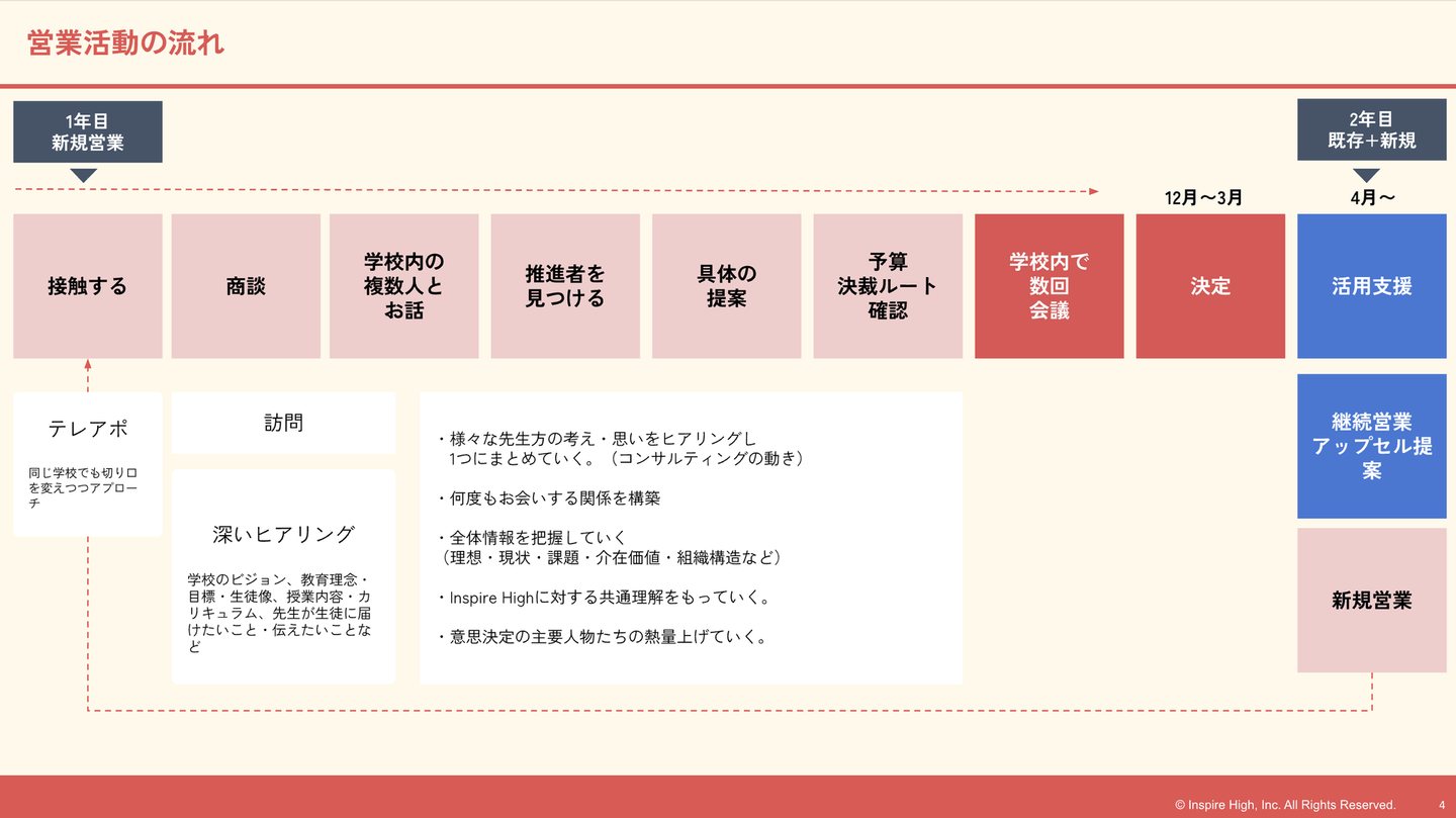 Inspire Highの場合は、次年度予算の検討月である1〜3月に向けて、結論を急がずに、じっくりと時間をかけながら学校との関係構築をしていくことが多いので、「会話が好き」「人と話すのが好き」という方は、本当にこの仕事が向いていると思います。