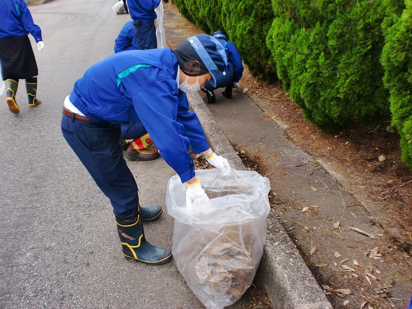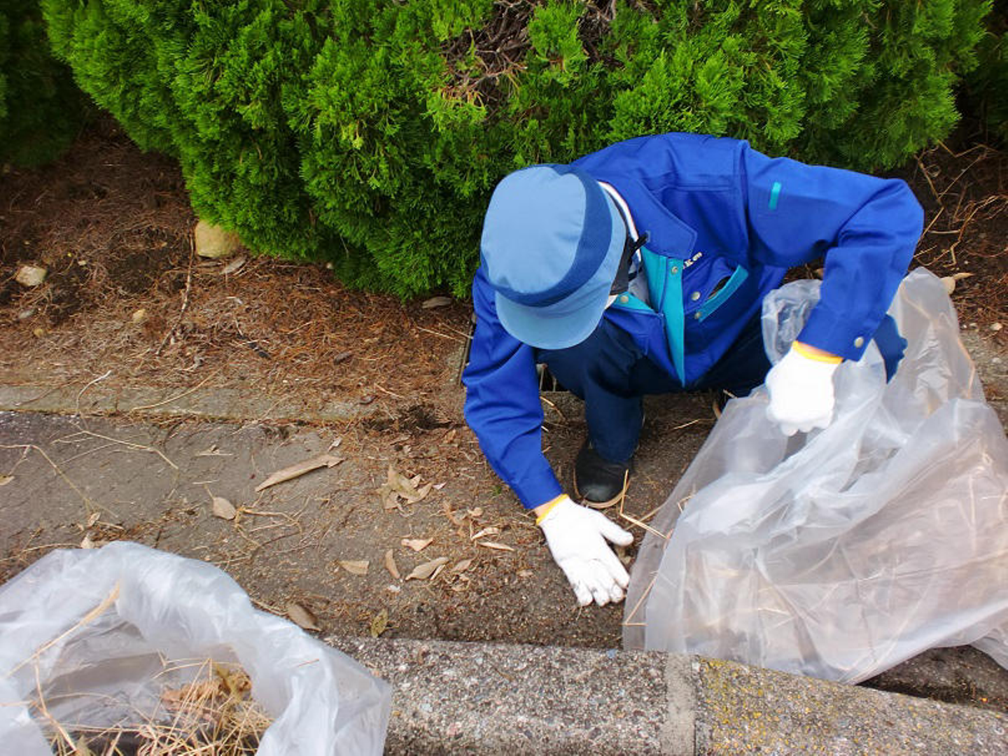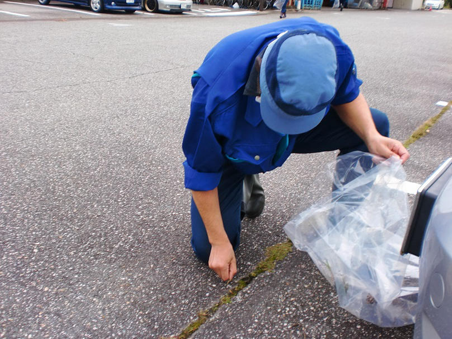前半組の担当は駐車場などの敷地内です。側溝のゴミを拾ったり、雑草を抜いたりと