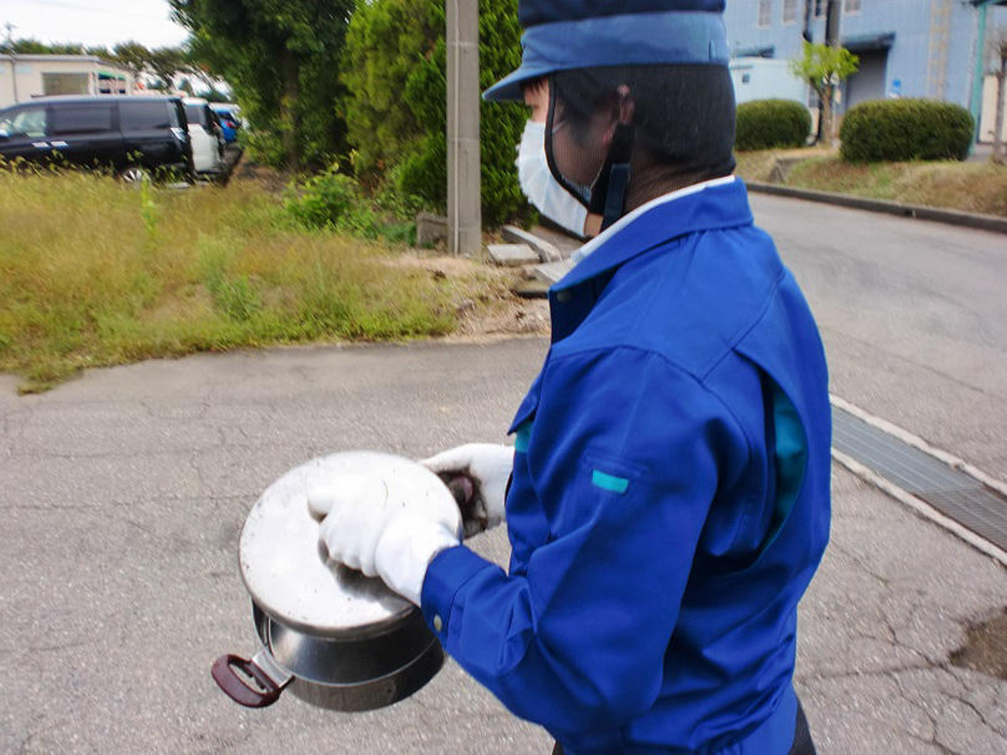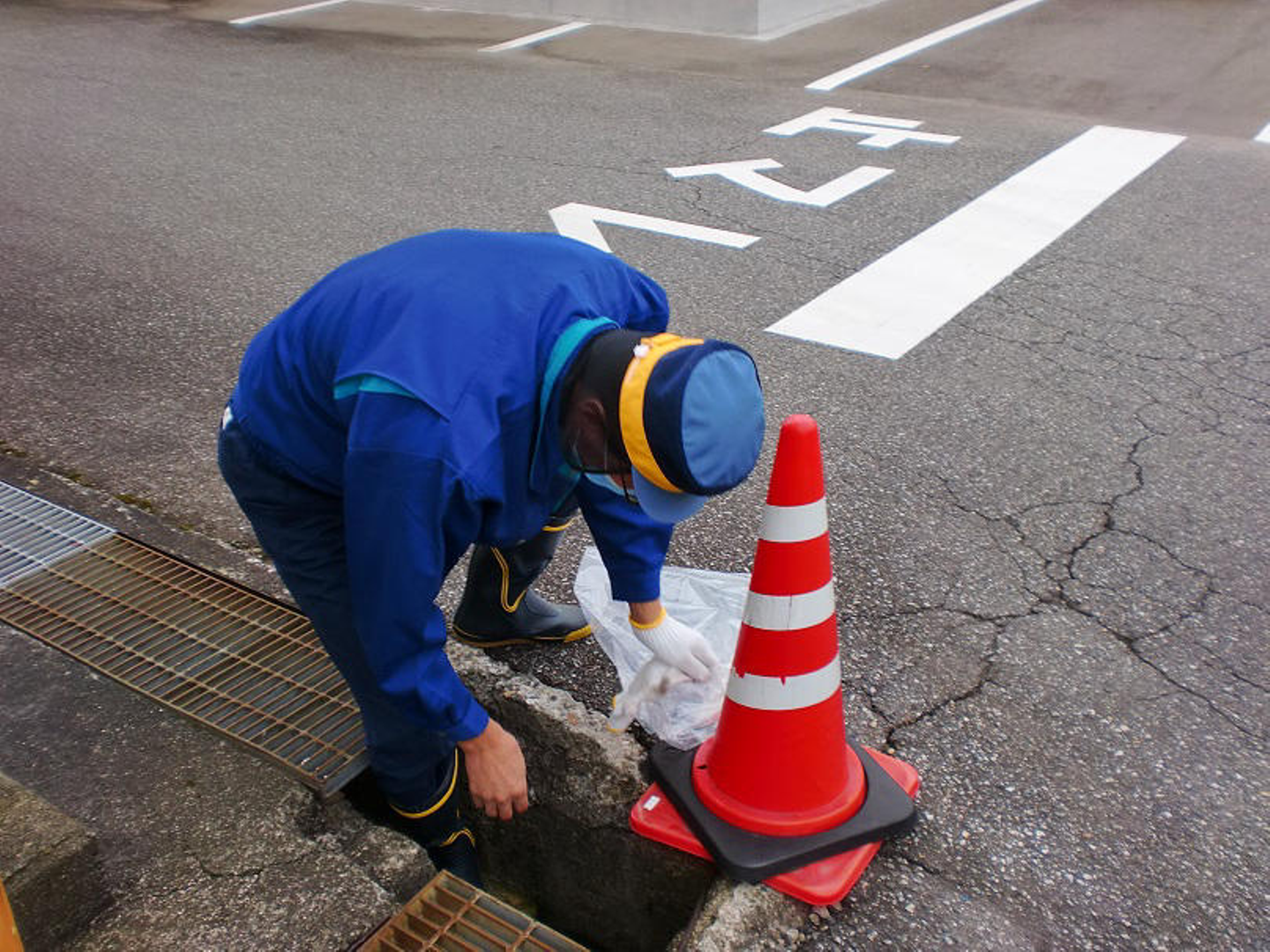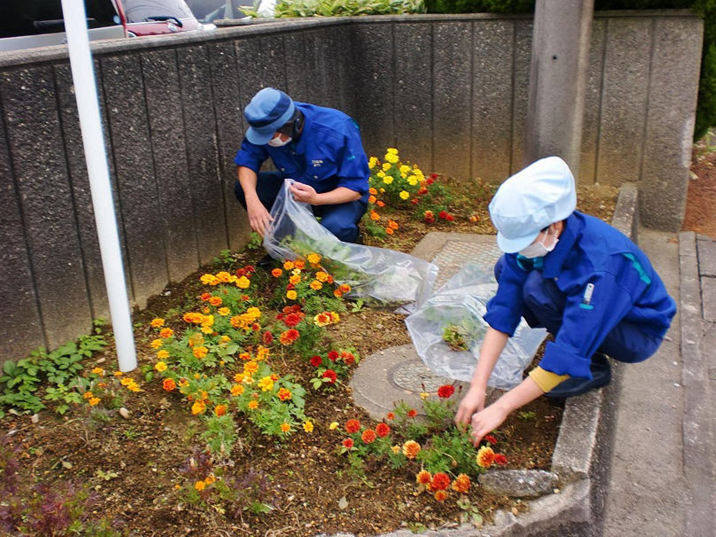 前半組の担当は駐車場などの敷地内です。側溝のゴミを拾ったり、雑草を抜いたりと