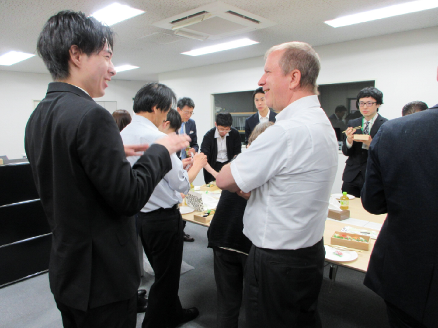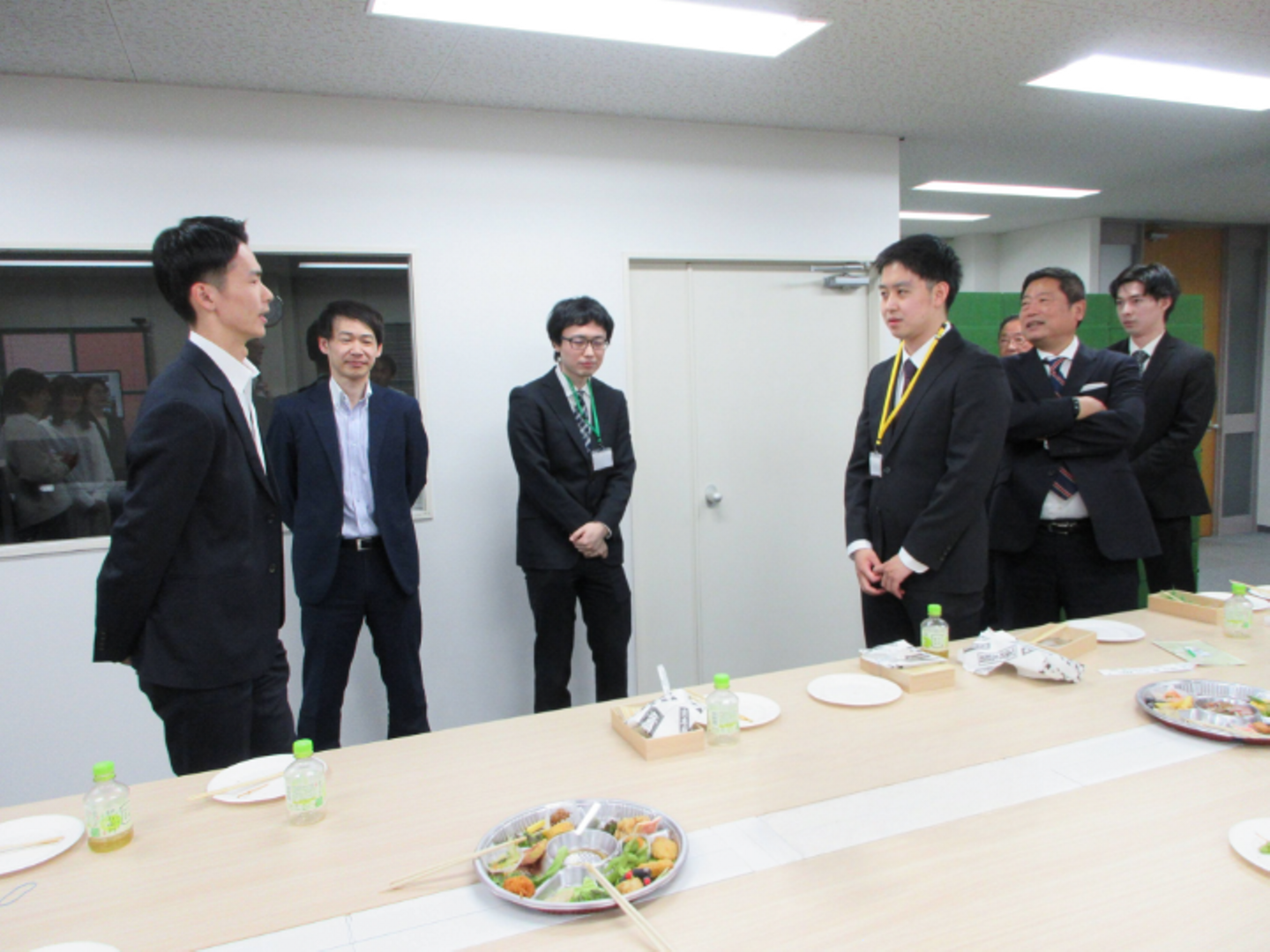 入社式・歓迎メッセージの後は、オフィス内でランチ懇親会が行いました。お寿司をはじめとしたオードブルが用意され、和やかな雰囲気の中で昼食を楽しみました。