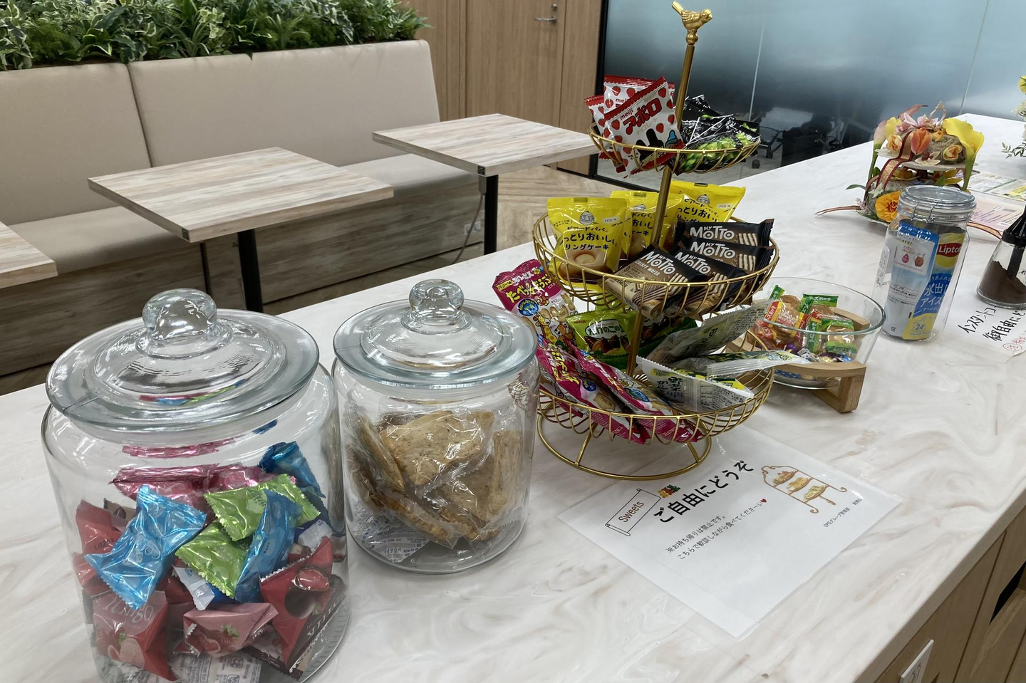 3つ目はコワーキングエリアの一角にある無料お菓子コーナーです。こちらもグループ社員同士の交流のきっかけになればいいなという想いで企画しました。不定期の提供になるため必ず置いてあるものではないのですが、夕方の小腹が空いたときにお菓子があると、とても救われた気持ちになります(笑)。すぐ近くに無料の飲料コーナーもあるので、気分転換にはぴったりです!