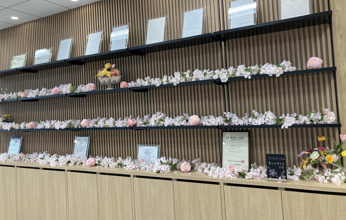 3つあります。1つ目は本社のエントランスです。「お客様の記憶に残るエントランスにしたい」という想いで、こだわって装飾しています。総務グループで季節ごとにテーマを決め、メンバーとの間で試行錯誤しながらどんな装飾にするか考えています。