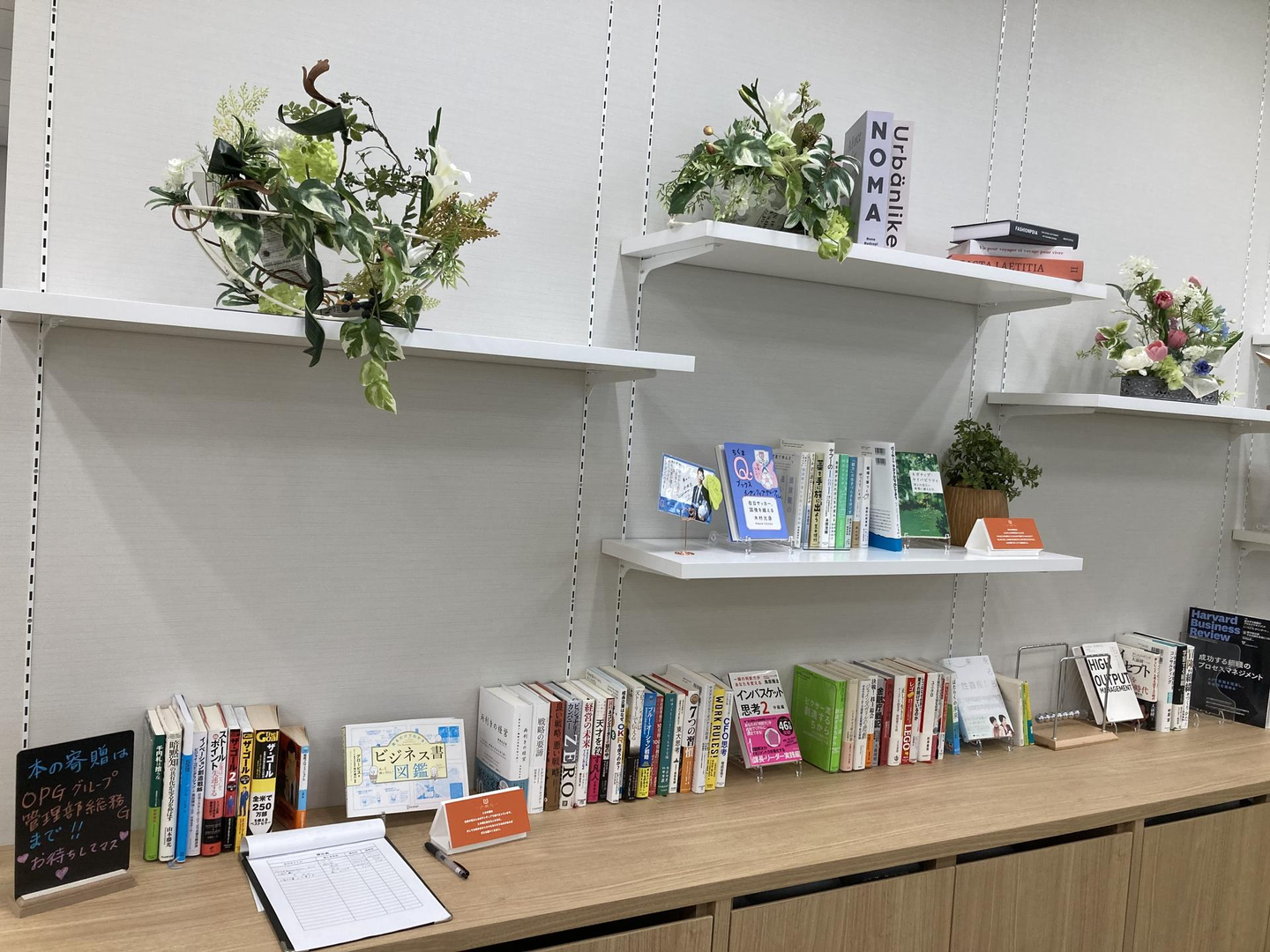 2つ目は、コワーキングエリアに設置した図書コーナーです。こちらも総務グループで企画したものです。普段仕事では接点のないグループ社員同士の会話のきっかけになればという想いで企画しました。まだまだ始めたばかりの企画ですので、これからどのように作用していくか、私も楽しみです。ビジネス書から「チ。」や「メダリスト」などの漫画まで幅広いジャンルの本を置いています。
