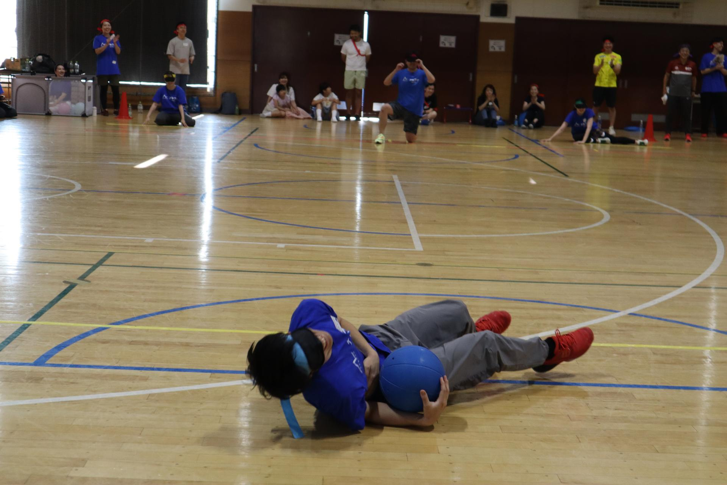 ■ゴールボール パラリンピックの正式種目。全員がアイシェードを着用し、音を頼りにプレーします。