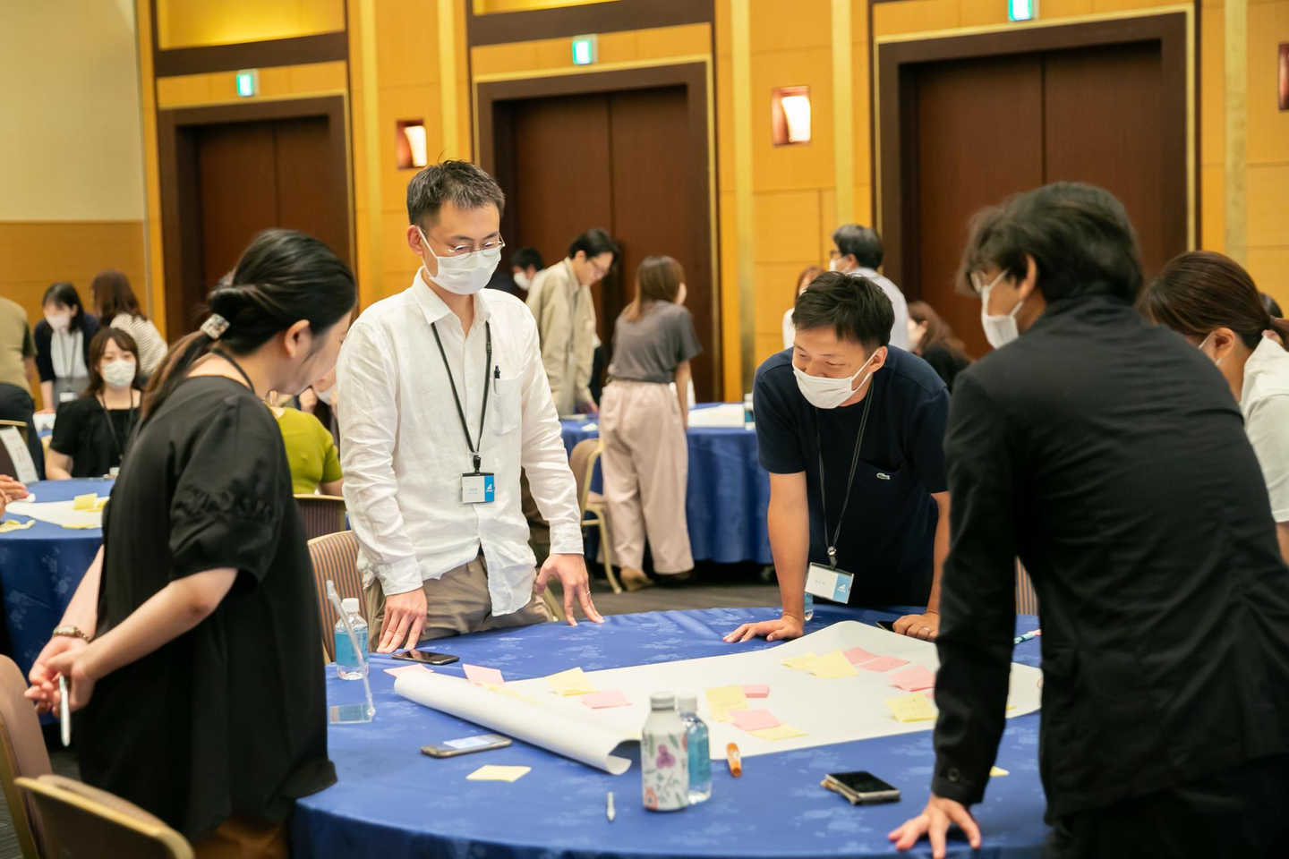 まずは個人ワークでふせんにアイデアを記入し、その後グループ内でアイデアを共有したりしながら、社員がどんな風に考えているかの理解を深めていきます。経営陣のテーブルも一生懸命にアイデアを考え、ディスカッションが白熱していました。
