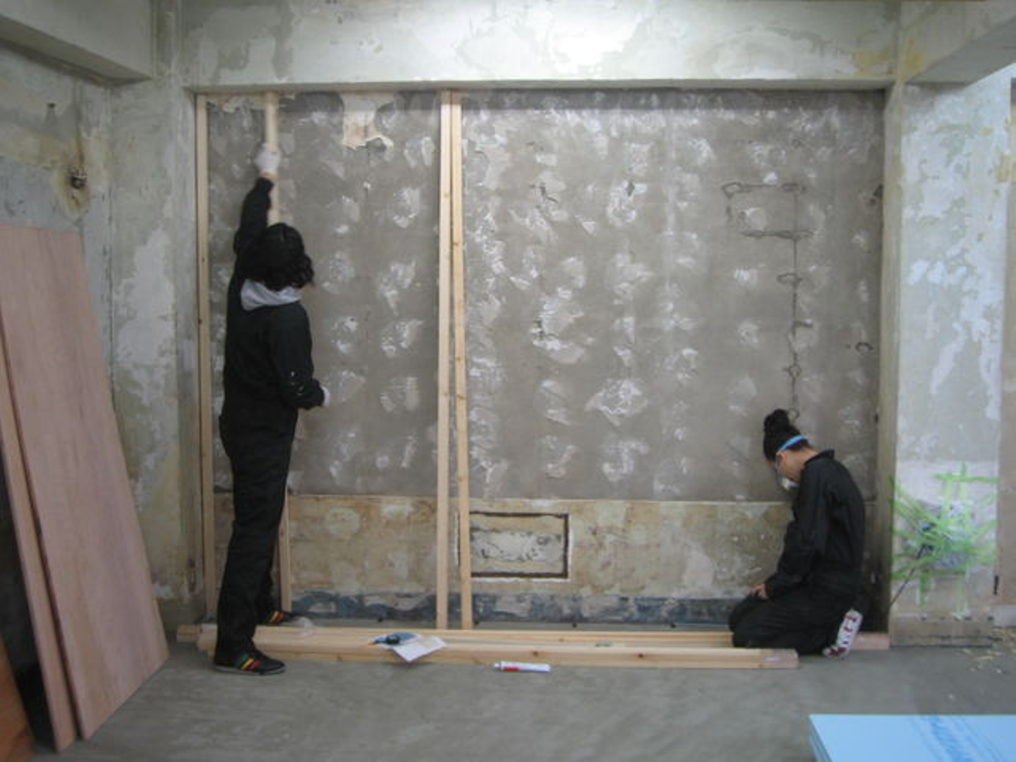 ↑モフ設立初期の事務所の壁を自分たちで塗っている荒川さんと阿部さん。