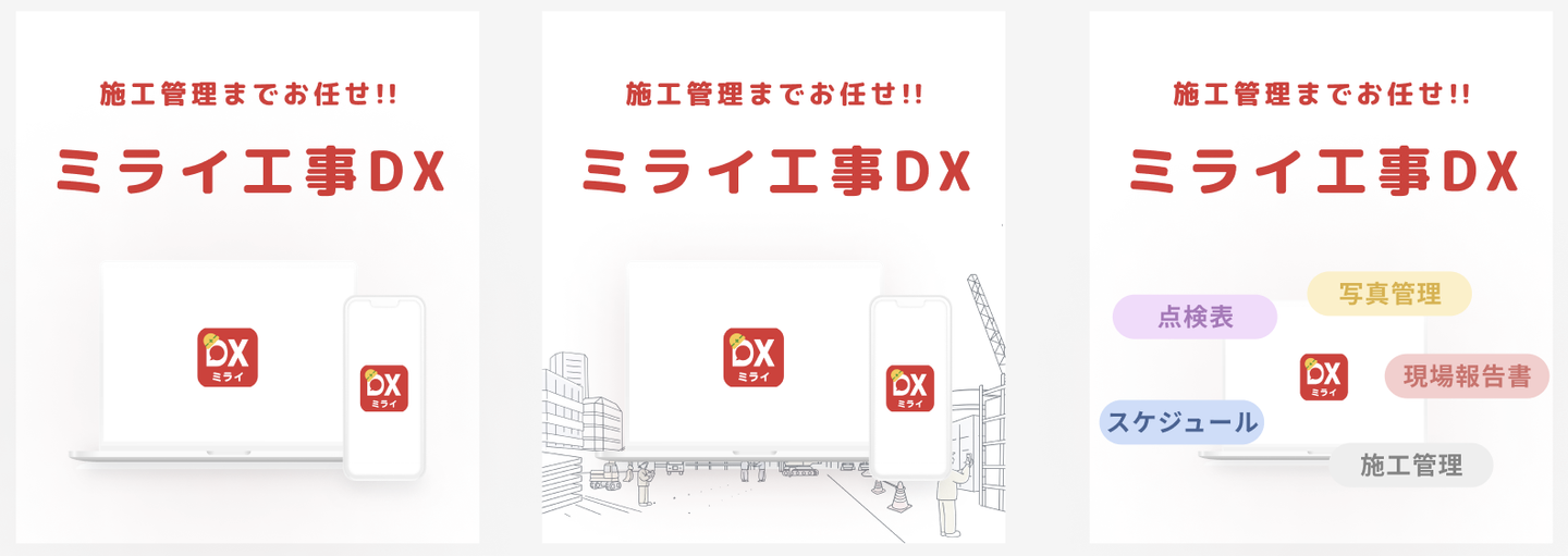 今回は、ミライ工事DXという新アプリが登場するのですが、そのLPページに遷移させるための導線をどう作るというところから話が始まっています。