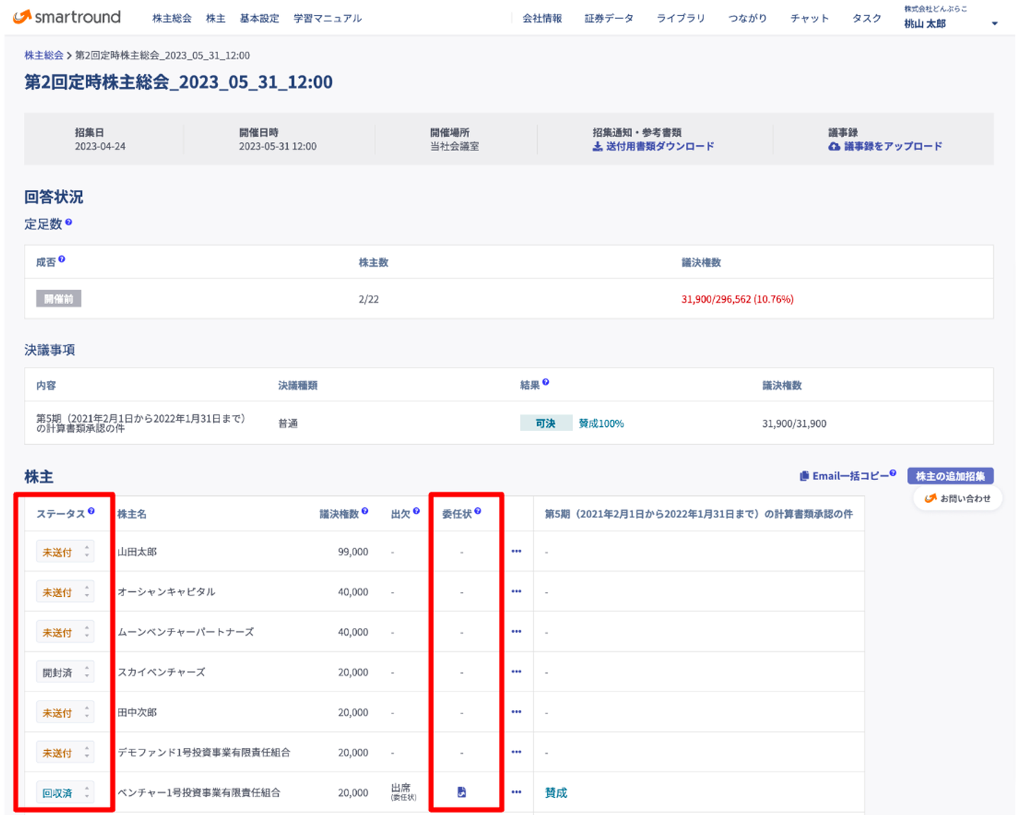 株主の委任状の回答ステータスも一目でわかります。smartround以外で回収した委任状もアップロードして一元管理が可能です。