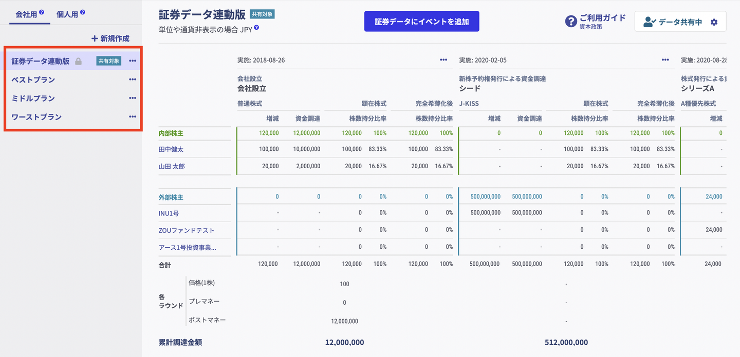 実際の株主データと連動した資本政策表が作成可能。複数の資本政策シュミレーションも作成できます。