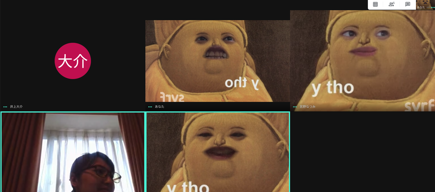 ちなみに、社内でのミーティングは事情があって顔を出したくない人はsnap cameraでビデオに参加していたりします笑