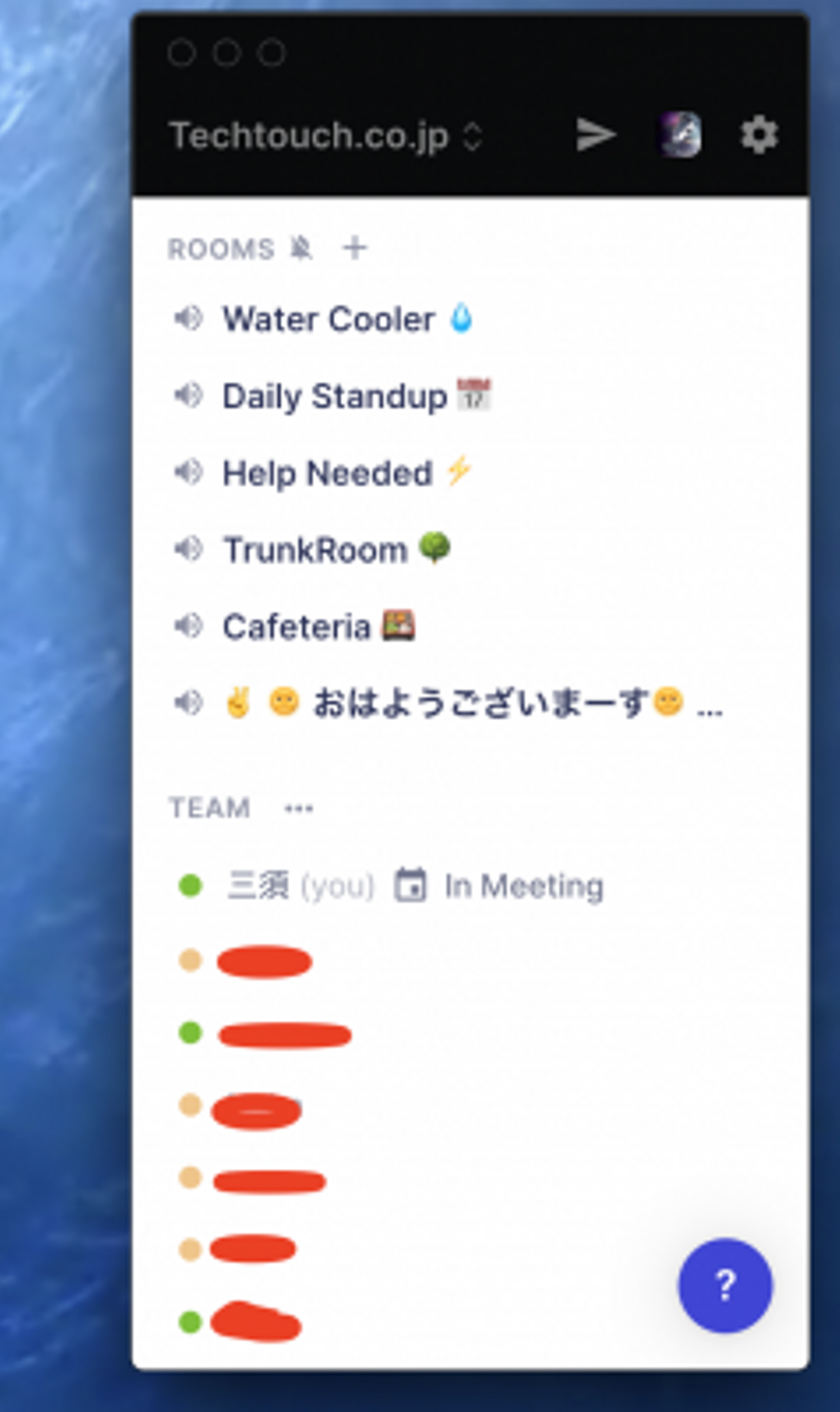 勤務開始時におはようございます部屋に入って雑談していたり、slack のリマインダで雑談部屋(画像で言うWater Cooler) に入りませんかという運用もしています。(たまにみんな忙しくて部屋に誰も来てくれないことも笑)
