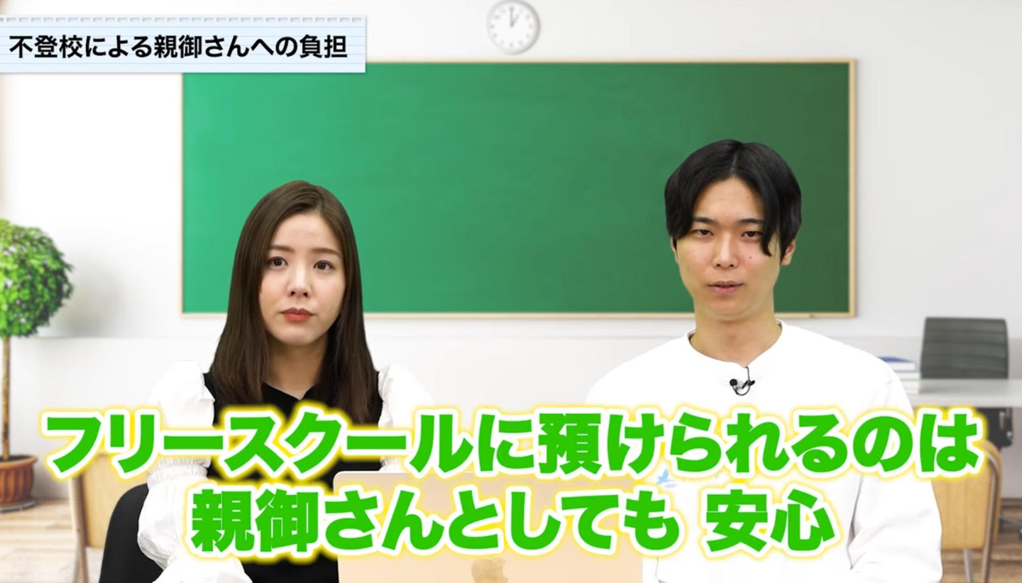 不登校の生徒に対して学校に戻すことを目標に語りかける傾向にあることを踏まえ、苦しみながら学校に通わせるよりも、学校に戻らない新たな選択肢があっても良いのではという意見もあり、フリースクールに通っていても制度上は学校の授業が出席扱いになる場合もあるとともに、好きな時に好きなことができる点で魅力的である為に、学校以外の新たな居場所として今もなお注目されています。