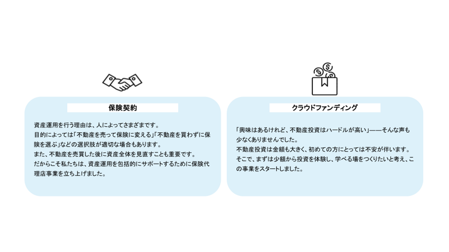 そして、これまで培ってきた投資用不動産の知識と経験こそが、自分にできる貢献だと確信しました。お客様に真摯に向き合い、期待を超えることにこだわり続けてきたからこそ、不動産を通じて安心と豊かさを届けられると考えました。