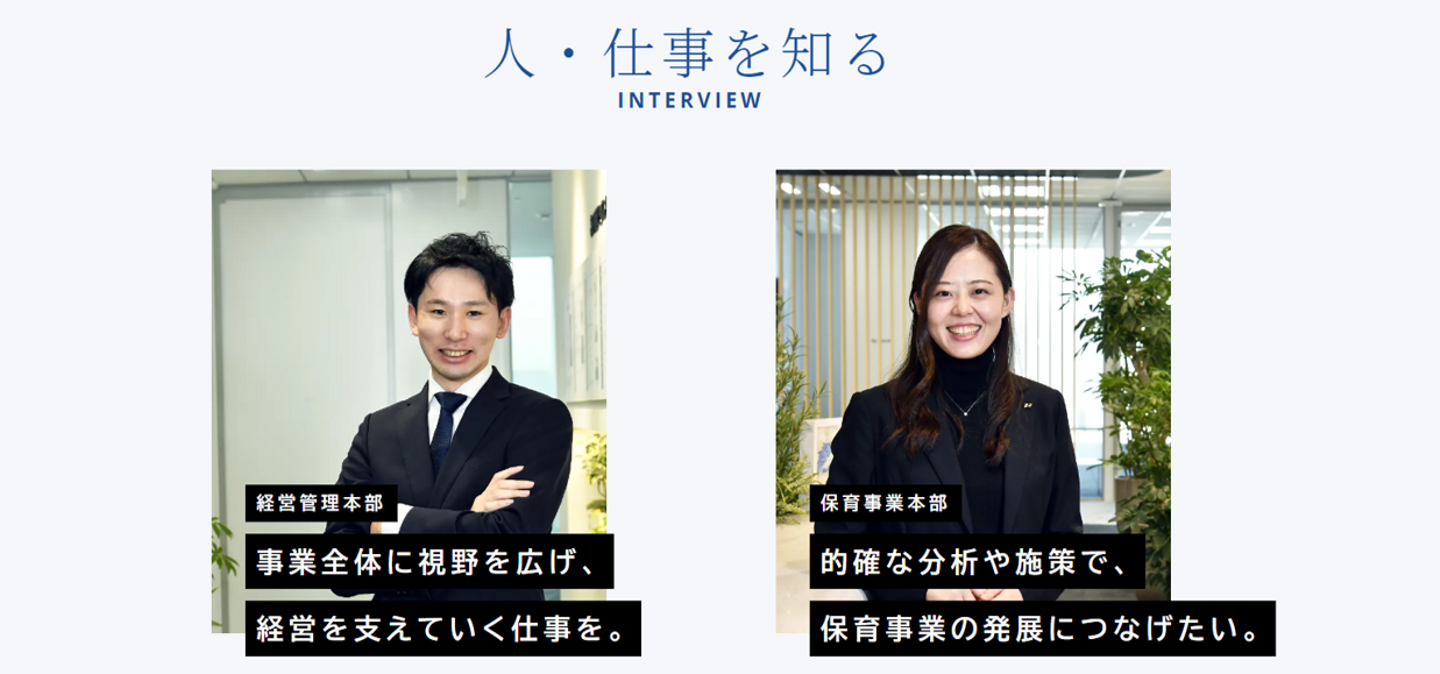本日は経営管理本部の松田さん、保育事業本部の伊藤さんのお二人のインタビューを掲載しました。