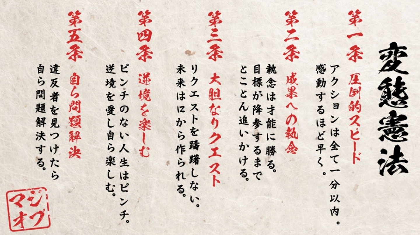 私たちの事業は主に ”お客様の『変わりたい』を後押しする” サービスですが、そのためにはまず自分たちが日々変わって(変態して)成長していかなければいけないという議論から、日本一の変態集団になるという組織の目標が決まりました。その上で「じゃあ我々が思う ”変態” ってなんだっけ?しっかりバリューとして言語化しよう!」と定義づけることになり、変態憲法の5か条をみんなで決めました。