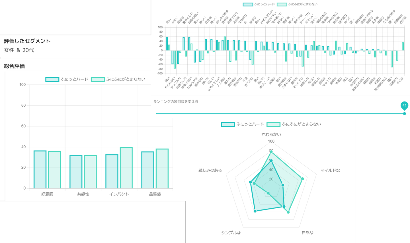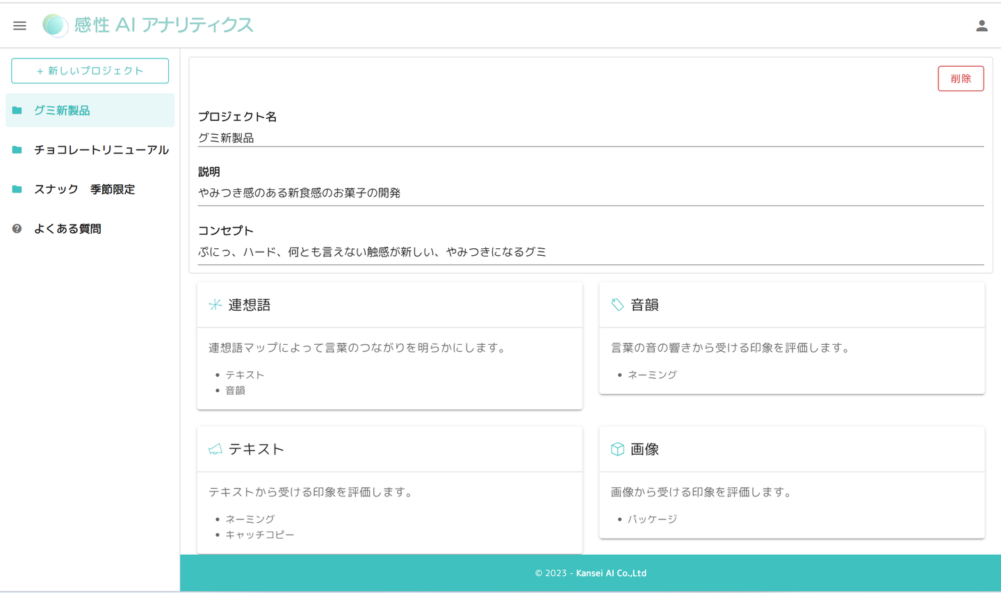 感性分析結果をより直感的に把握しやすい表示にリニューアルするとともに、プロジェクトごとに分析結果を保存できる機能を追加しました。食品や日用品のメーカーのご担当者が複数のプロジェクトを抱えていても、プロジェクト毎に消費者にコンセプトが伝わるネーミング、パッケージデザイン、広告コミュニケーションなどの分析が可能になりました。
