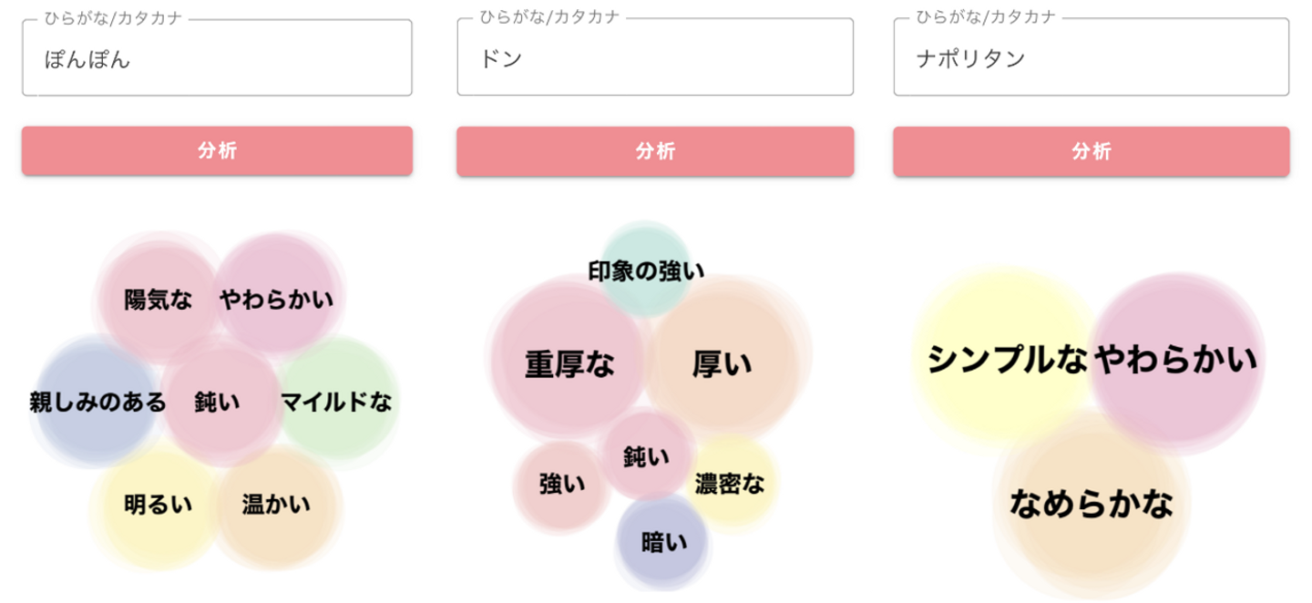 AIが音の響きの印象を推定! 言葉の読み(ひらがな/カタカナ 20文字以内)を入力すると、 その言葉の響きから受ける印象を86種類の感性の中から推定します。 ・ 感性AIアナリティクス をご利用いただくと、全ての感性の数値を表示することができます。本ページでの円の大きさは簡易的な表示でございます。 ...
