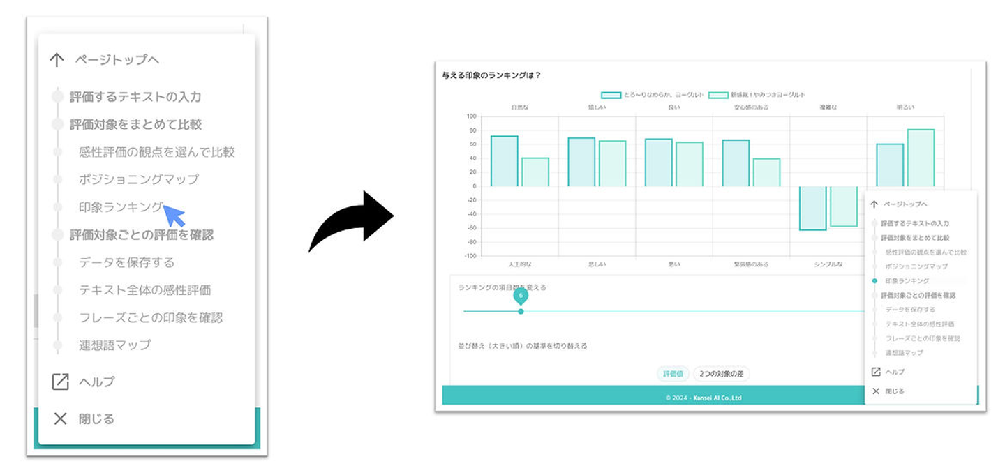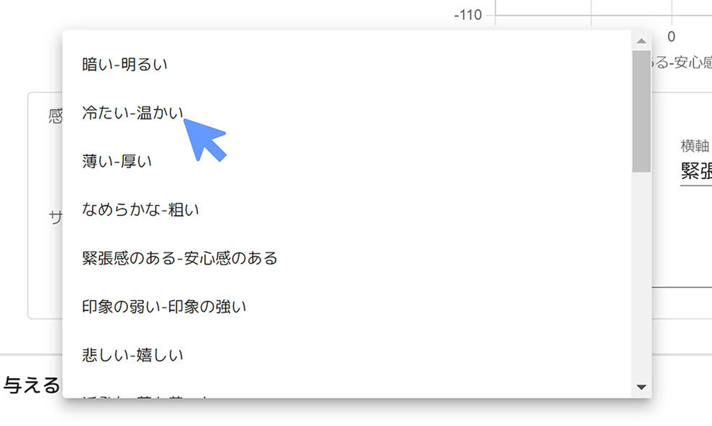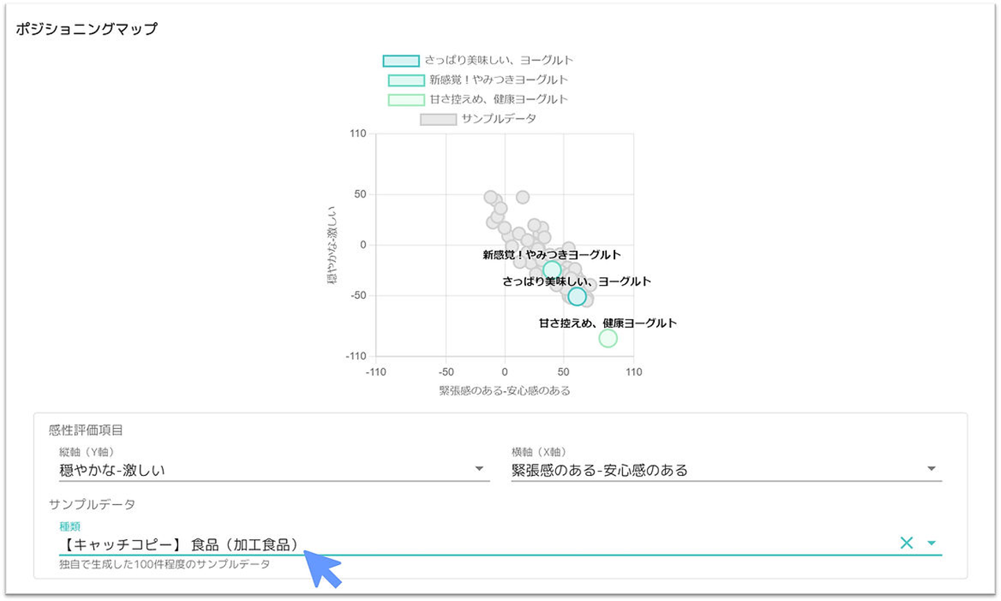 ポジショニングマップの縦軸と横軸は、印象項目です。この項目も自由に選んで表示できます。