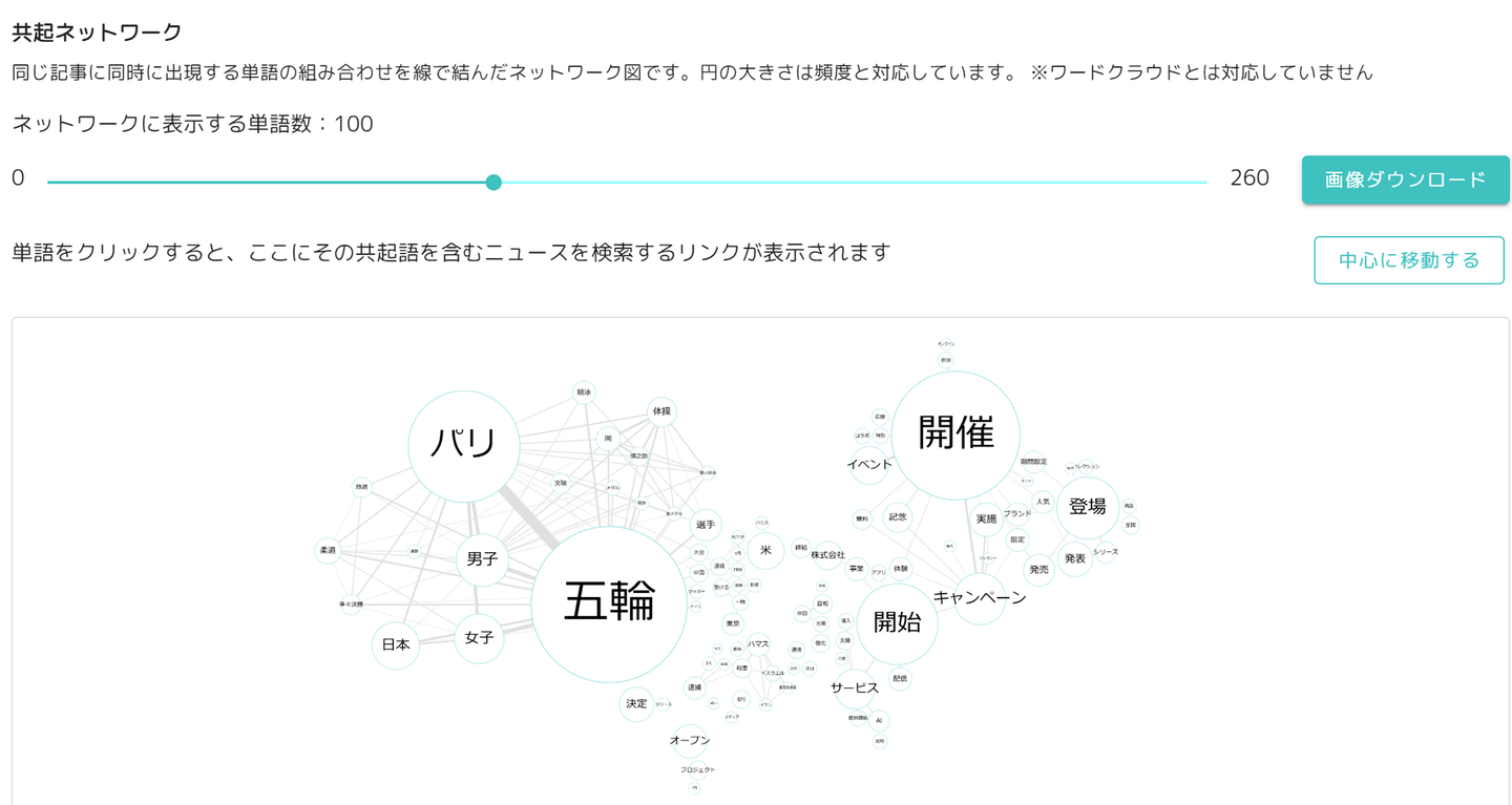 これは指定した日に掲載されたニュース記事のうち、その記事にあらわれた単語同士を結んだ図です。共起ネットワーク図から主要となるキーワードや、キーワード同士の関係がわかります。