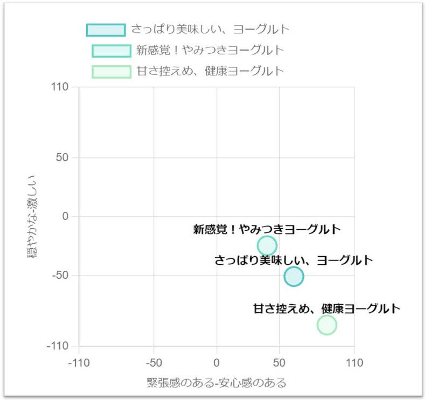 今回ヨーグルトのキャッチコピーを3つ、印象分析しました。ポジショニングマップを見ると、もっとも激しいと感じるキャッチコピーが「新感覚! やみつきヨーグルト」、もっとも安心感があると感じるキャッチコピーが「甘さ控えめ、健康ヨーグルト」であるとわかります。