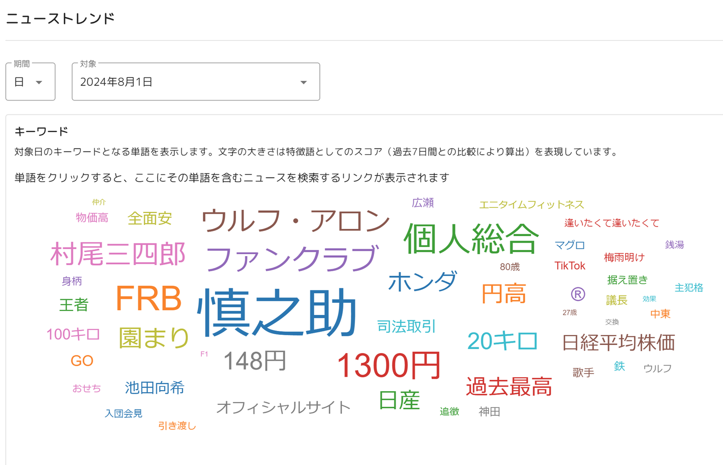 2024年8月1日のニュースを分析して、頻出しているキーワードをワードクラウドで表示しています。列島がオリンピックに注目している様子がわかりますね。一方で、日経平均株価が下落したことがニュースで多く出ていたことも一目で見てわかります。