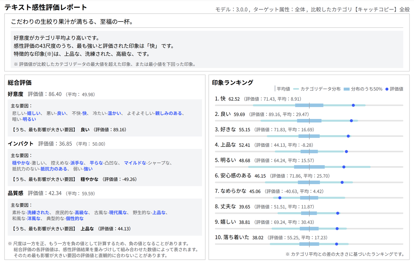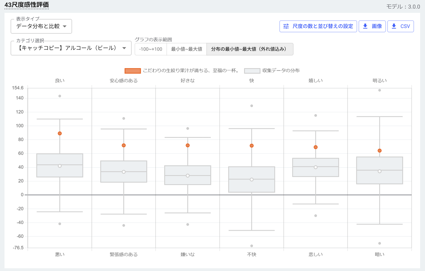 分析した結果を、当社が独自に収集した現実に実在するデータを評価した結果と比較することができます。テキストであればキャッチコピー、音韻であればネーミング、画像であればパッケージ画像の集合です。これにより、ビールメーカーのユーザーであれば、アルコール(ビール)のカテゴリと比較することで、自社のクリエイティブがどのような評価なのか、相対的に確認することができます。