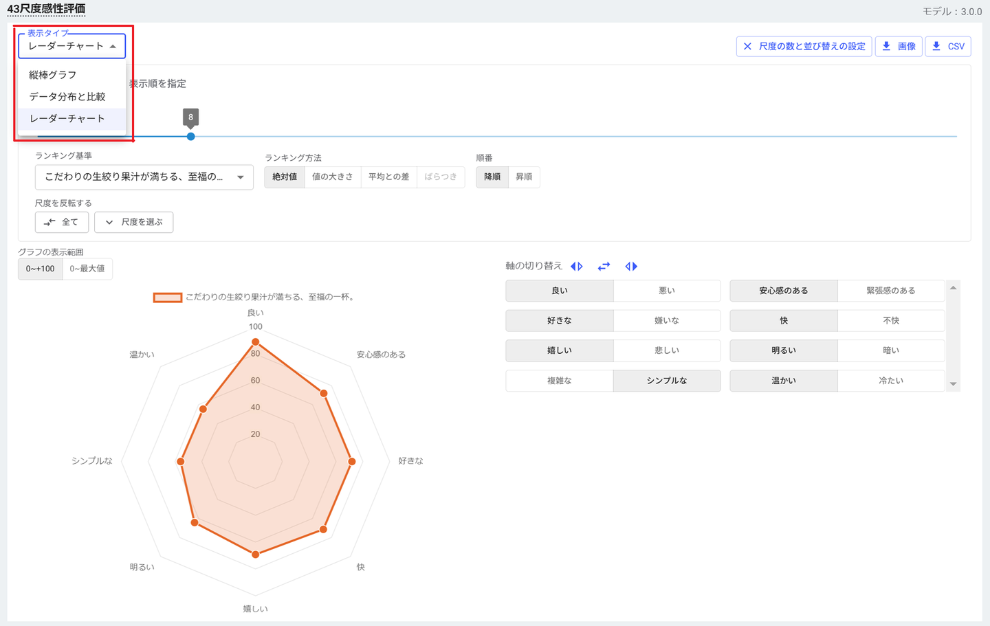 グラフの種類を「縦棒グラフ」「データ分析と比較」「レーダーチャート」から選択できるようになったほか、表示する尺度の選択、表示順等をユーザーが任意に設定することができます。(グラフの色も自由に設定することができます。)