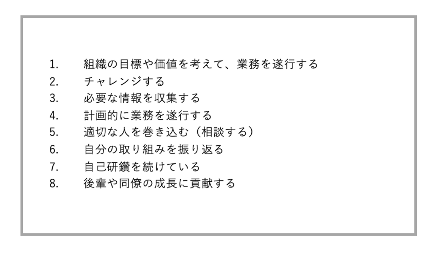 これらの項目は、高い目標が課される組織の中で、社員にご自身の役割を認識し、成果に繋がり得る行動を取ってもらうことを目的に設計をしています。