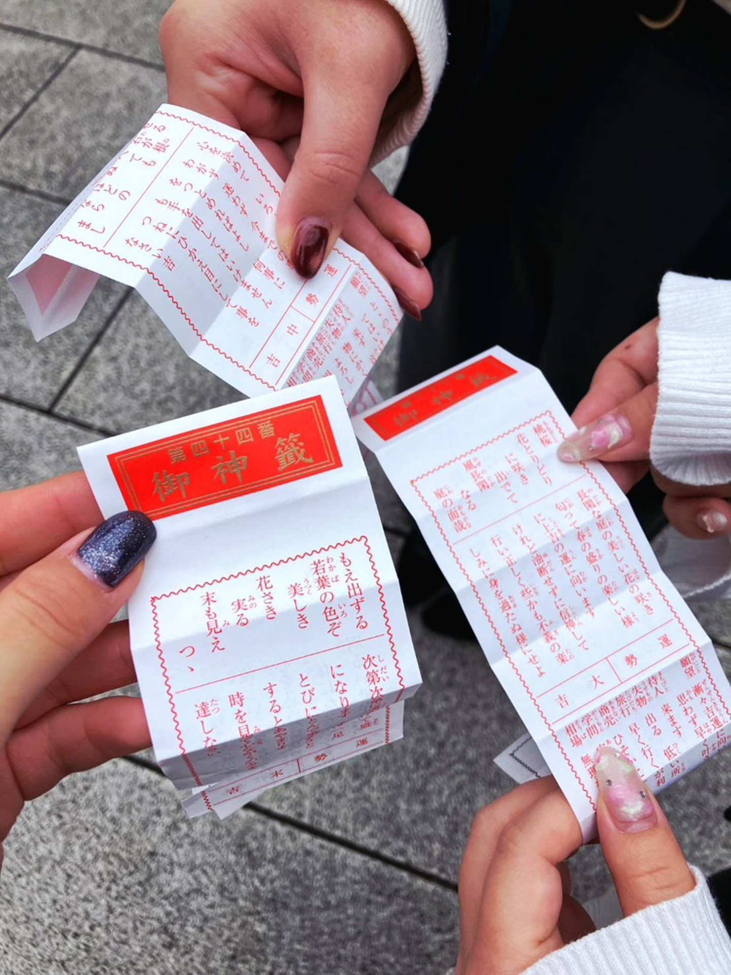 お詣りをした後、女性メンバーたちは仲良くおみくじを引いたそうで、