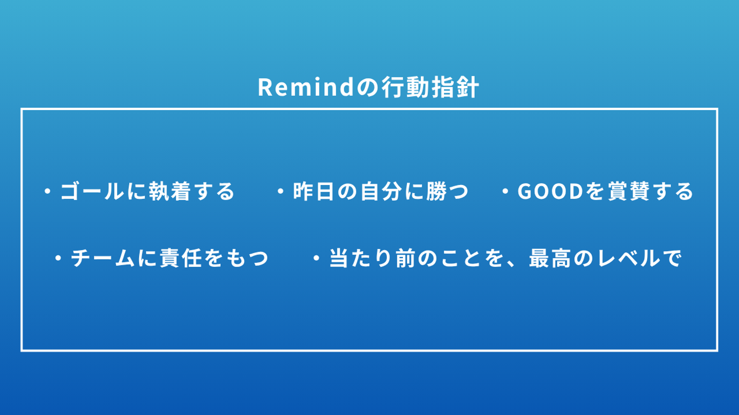 RemindではMVVを社内に浸透させ、メンバー全員がMVVを自分ごととして落とし込むため、行動指針も作成しました。行動指針とは、MVVを体現するための、より具体的な指標です。