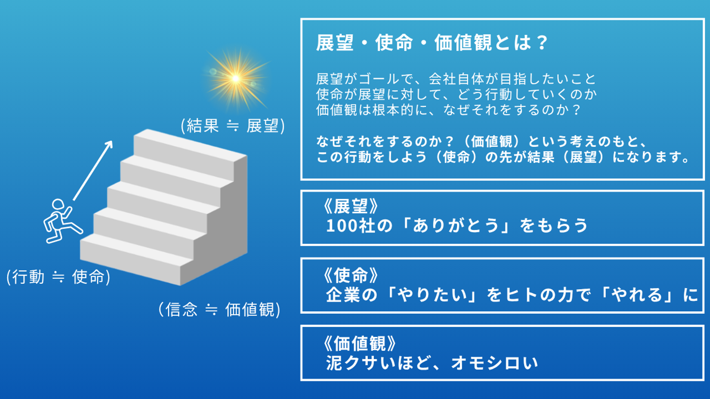 設定にあたり、Visionを「展望」Missionを「使命」Valueを「価値観」と定め、