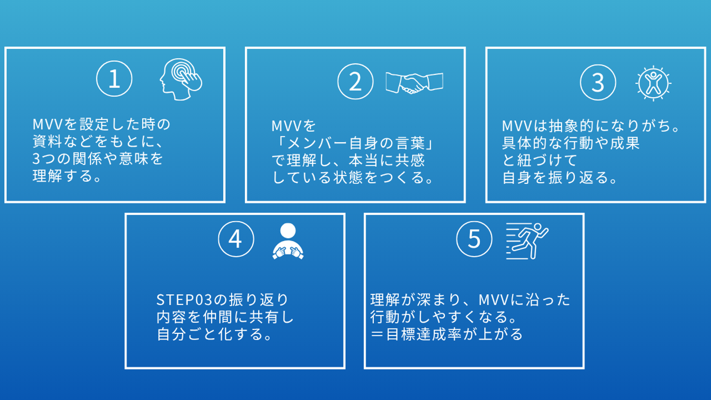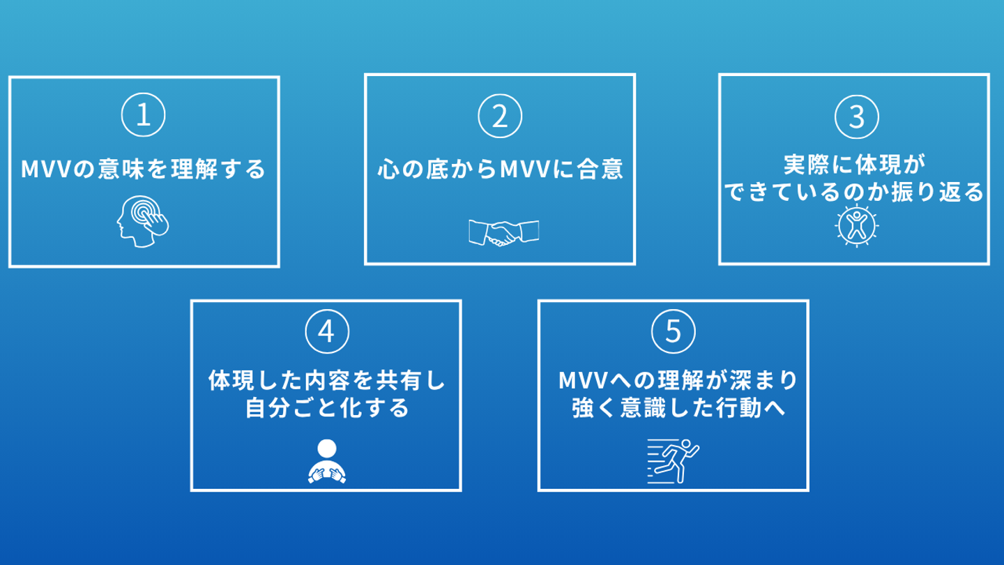 そこで自分ごと化し、MVVを真に体現するまでのステップを設定。現在は社内で、定期的な振り返りや