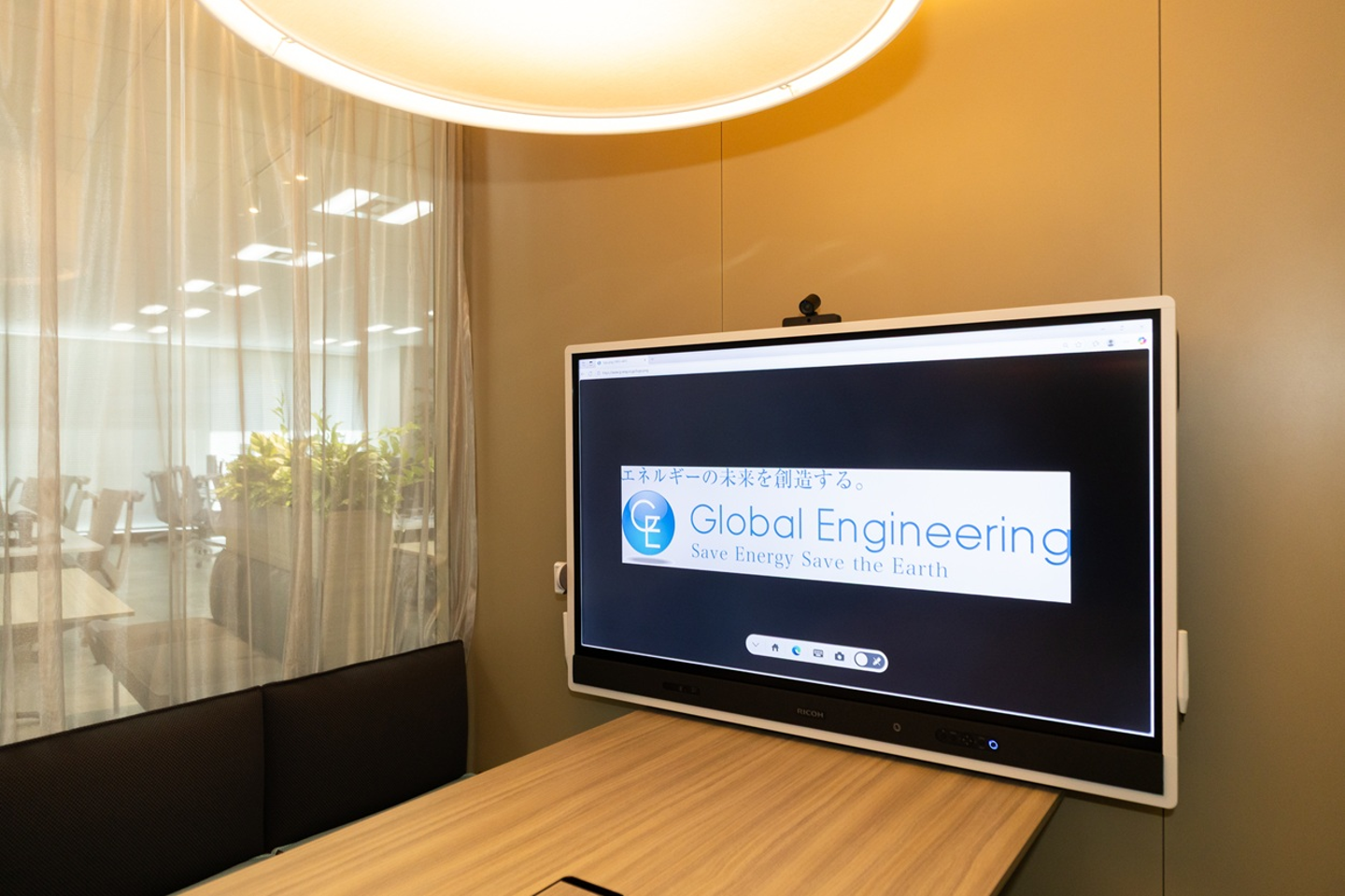 エントランスの写真中央、当社ロゴの後ろの位置に会議室が2部屋。WEB会議対応の壁掛けモニターが設置され、社内・社外の打合せに対応する会議室として活用。