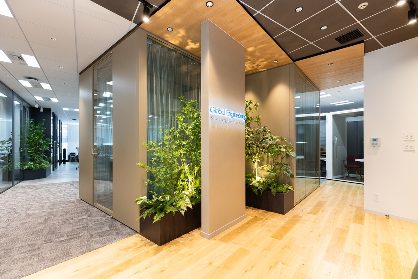 7.癒しとして各所にフェイクグリーンを配置。(予算の関係で数を減らす案もありましたが、私が「壁際の荷物積み上げ防止にも良い」として当初の案を推し、進めました…!不便に思われている当社員の方はご理解ください…。)