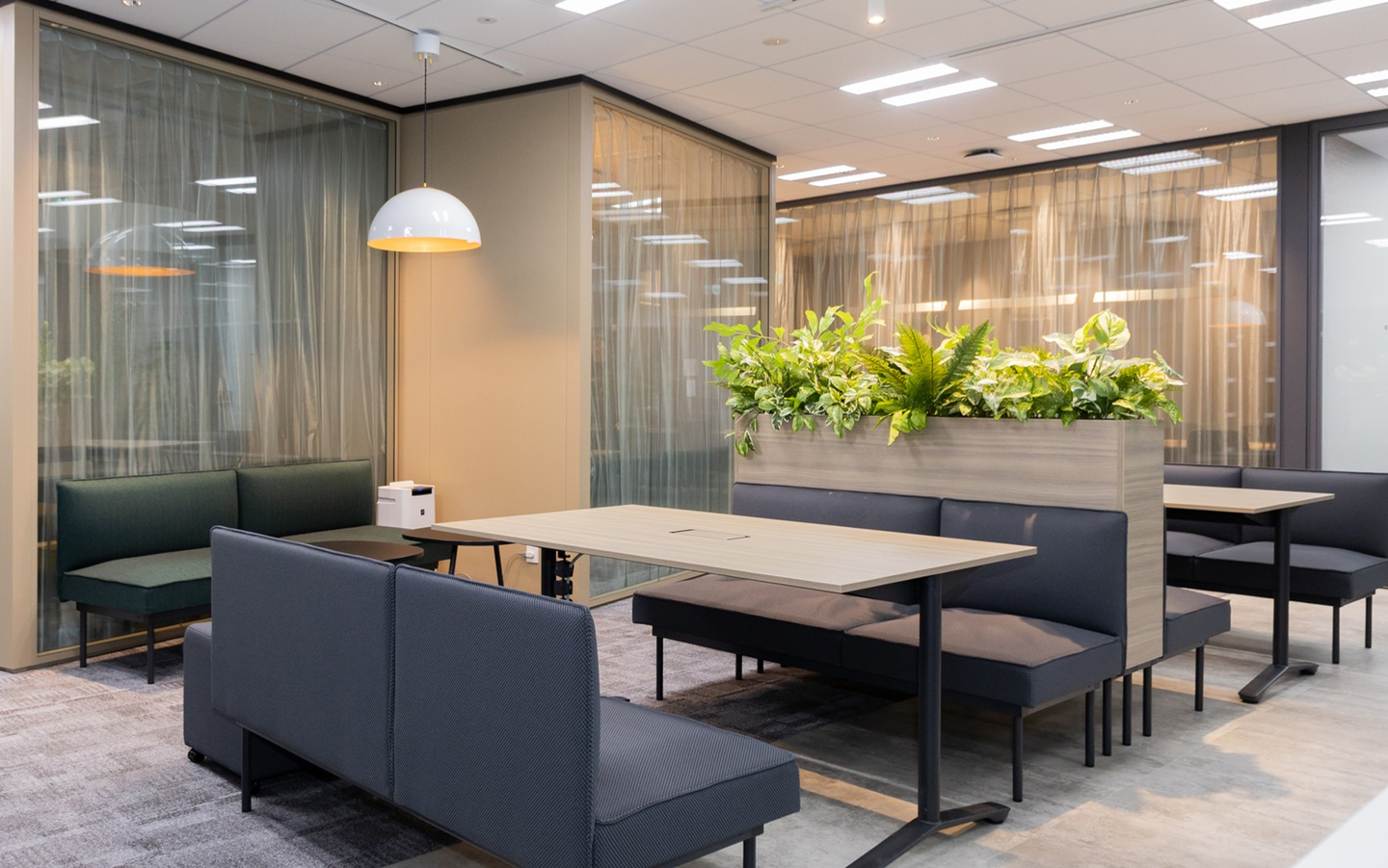 移転ストーリー(Vol.4)でも登場した対面式のソファー席。食事・休憩だけでなく出張者の一時業務スペースや社内打合せでも使える様、各机に電源も完備。