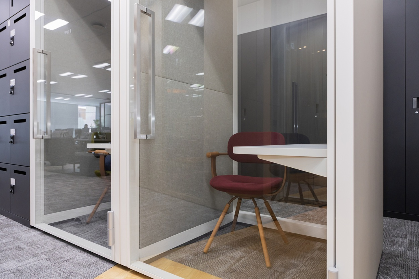 エントランスの写真右側の位置に2つ、WEBブース(消防法 対応済)を設置。周りの音を気にせずWEB会議に参加出来る一人用の集中スペースです。