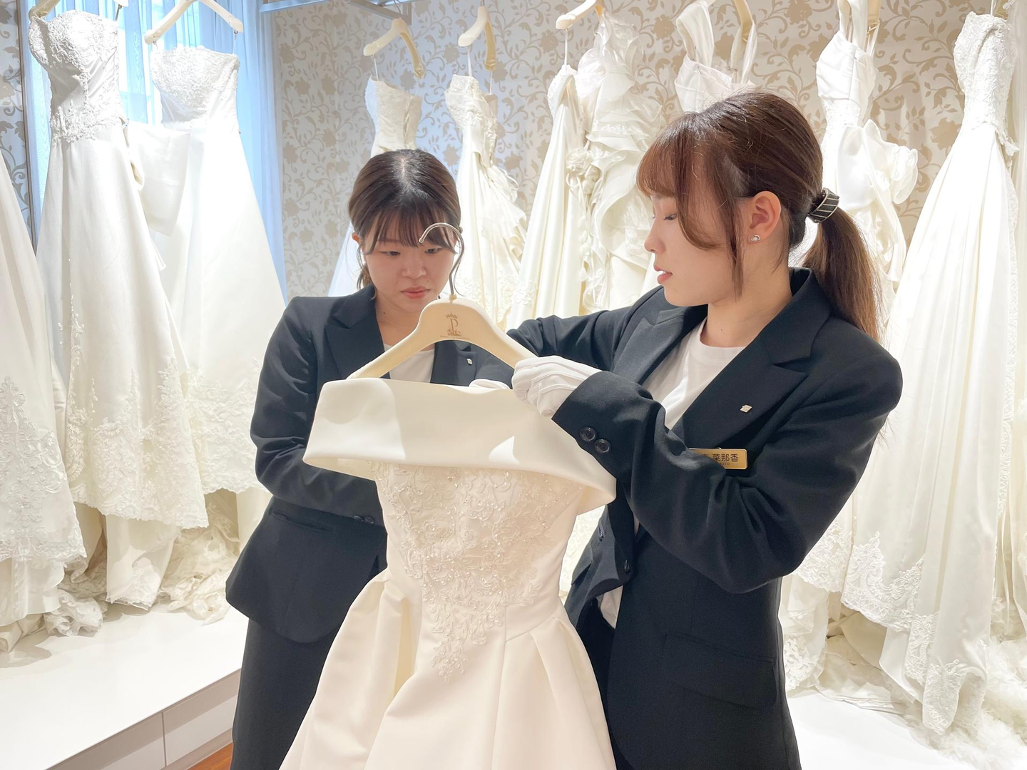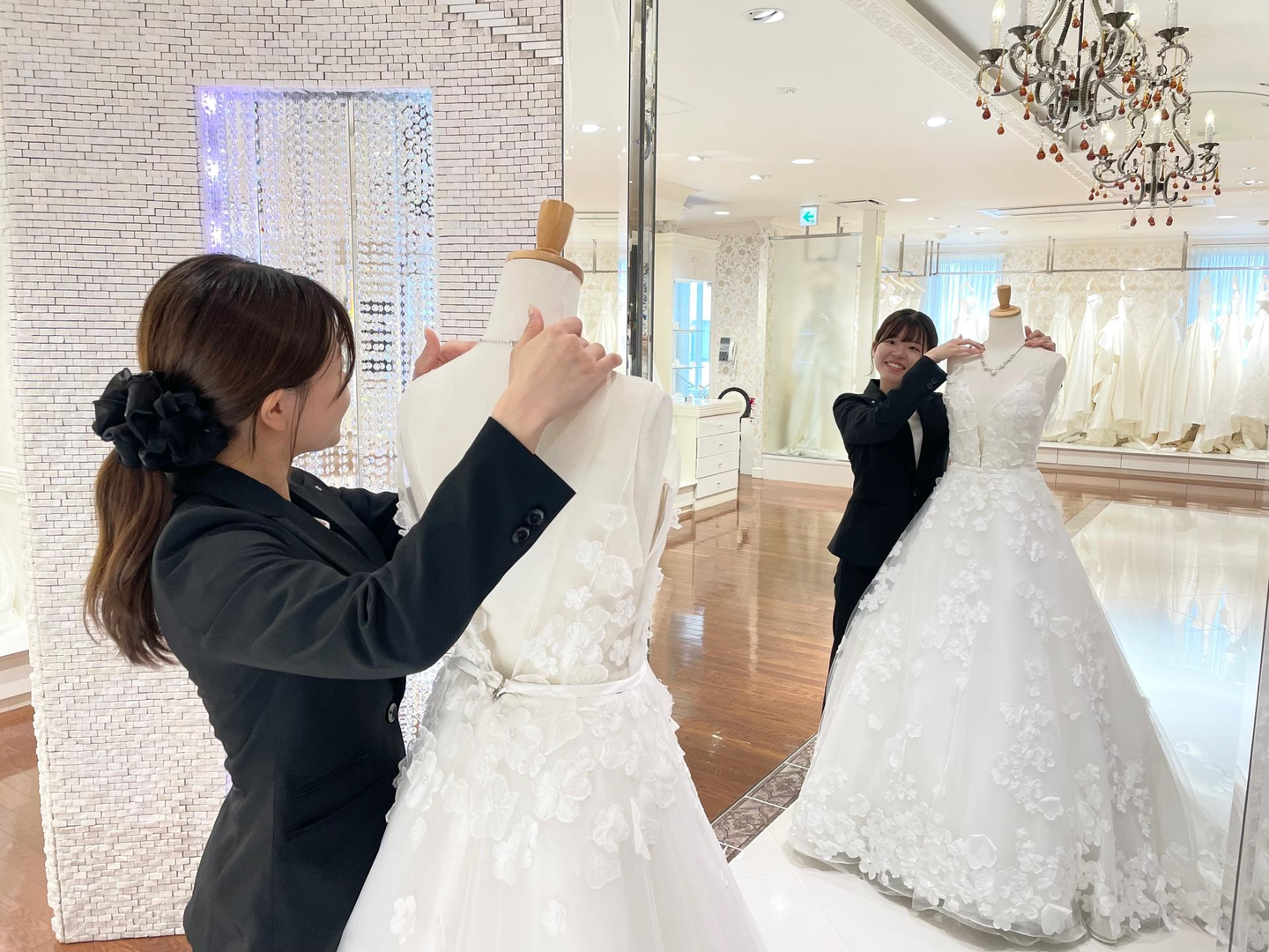 現在の仕事は、ウェディングパートナーとして、お客様のドレスの接客をメインにさせて頂いております。現在、徐々にタキシードのご案内もさせて頂いてます。