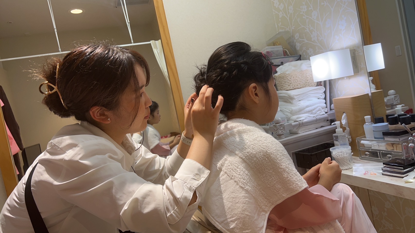 美容学校の授業ではただ黙々とヘアメイクを行うだけでしたが、実際にお客様のヘアメイクに入ることでコミュニケーションの大切さをより感じています。特に、フォトスタジオメゾンでは七五三からブライダルまで様々な年代のお客様のヘアメイクに入る機会があるのでお客様に合わせた会話を心がけています。