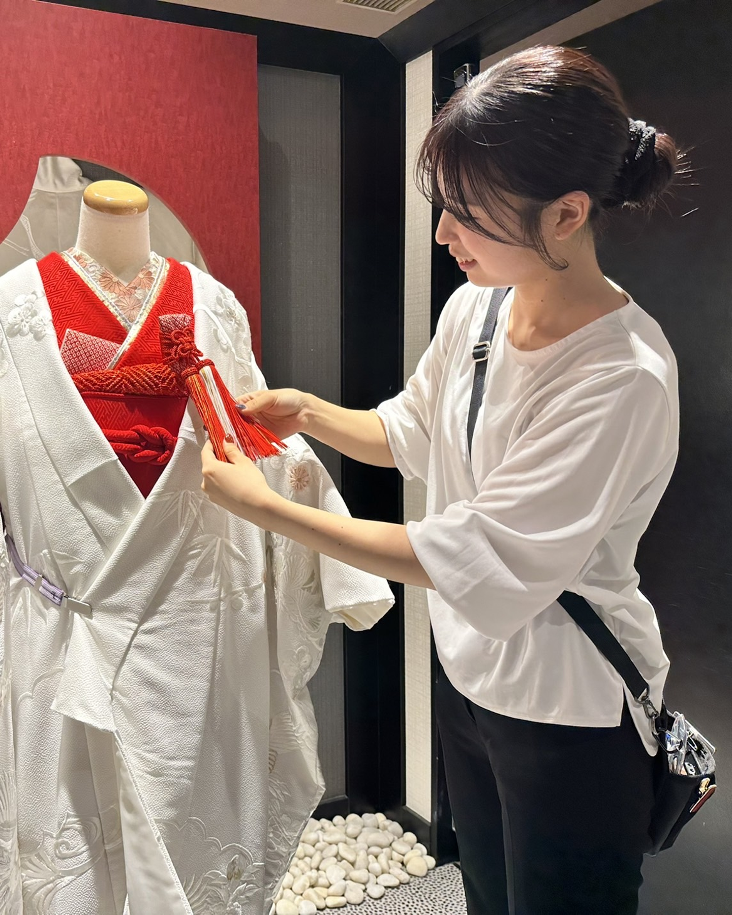 "現在はドレスの接客だけでなく、タキシードやモーニングの接客にも入らせて頂いております。また今月から和装研修もして頂き、先週検定試験に無事合格することが出来ました。和装につきましては今後先輩方の接客フォローに入りつつ、独り立ちを目指して参ります。接客の他にはジュエリー管理業務も担当しておりますので毎週決まった曜日に発注等も行っております。日々できることが増え、責任と共にやりがいを感じている毎日です。
